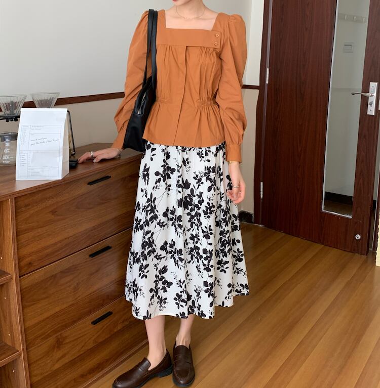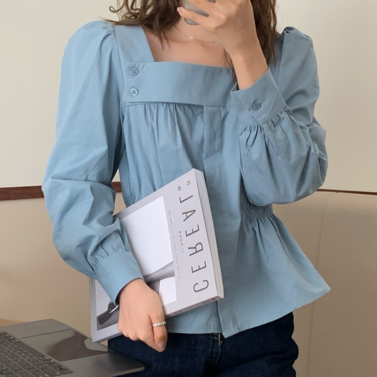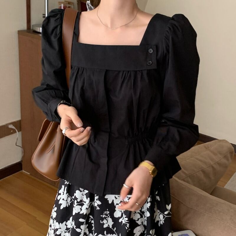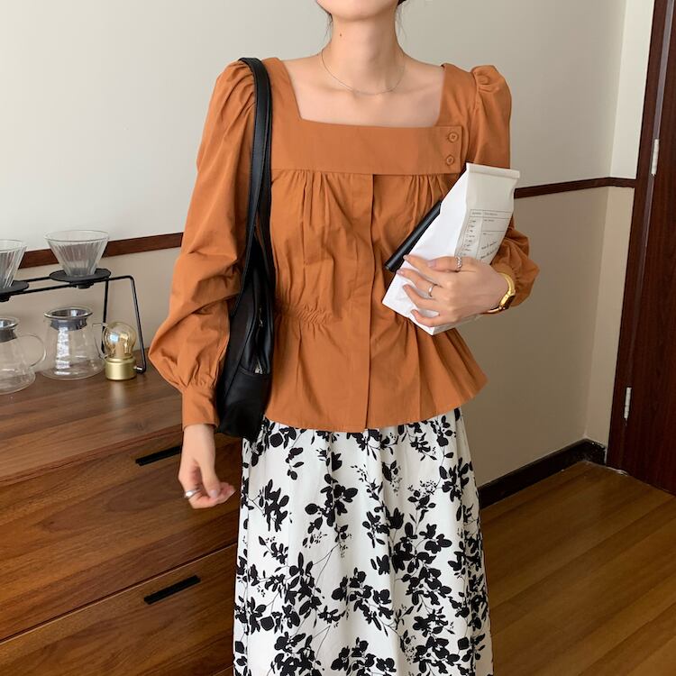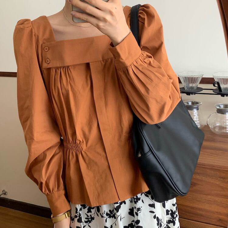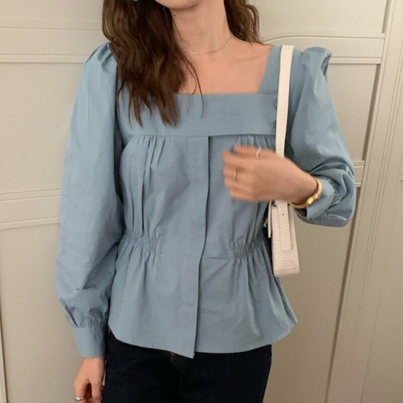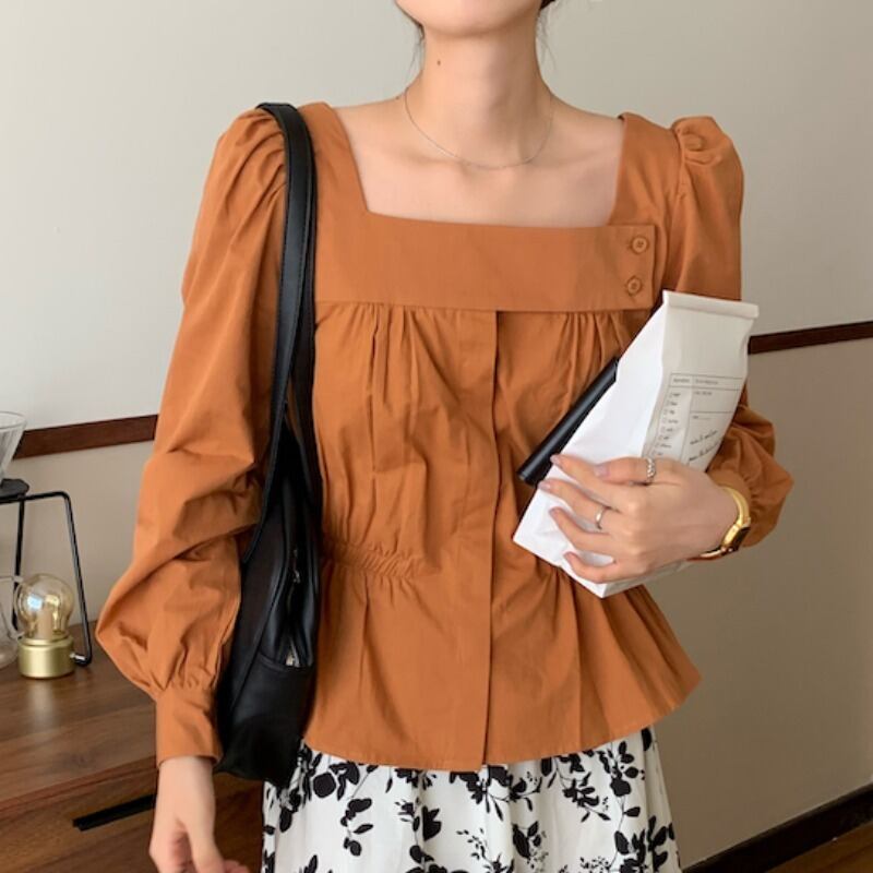 スタンダードスタイルカラースリム薄手ソリッド シャツ ロング レトロ ソリッドカラー スクウェア ICC_レディース86282666021