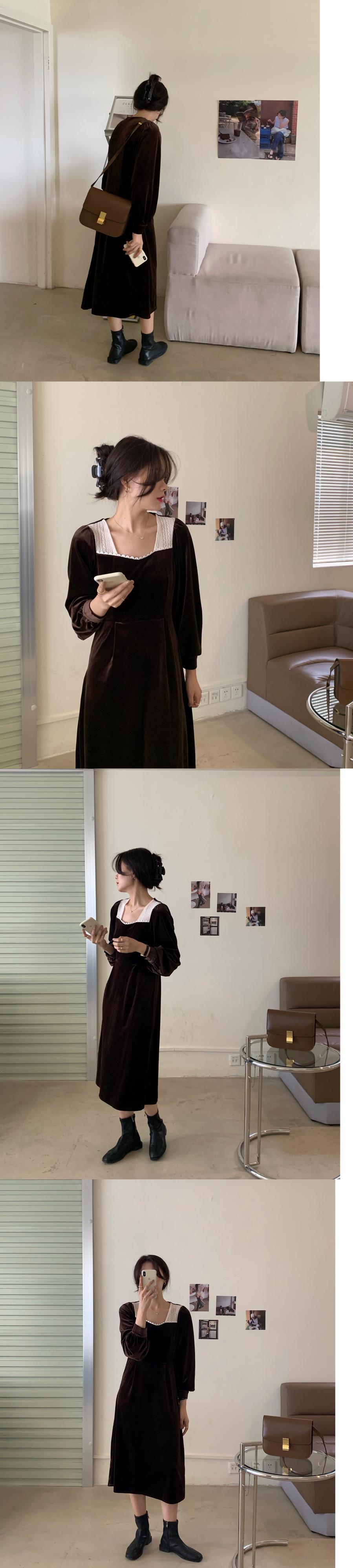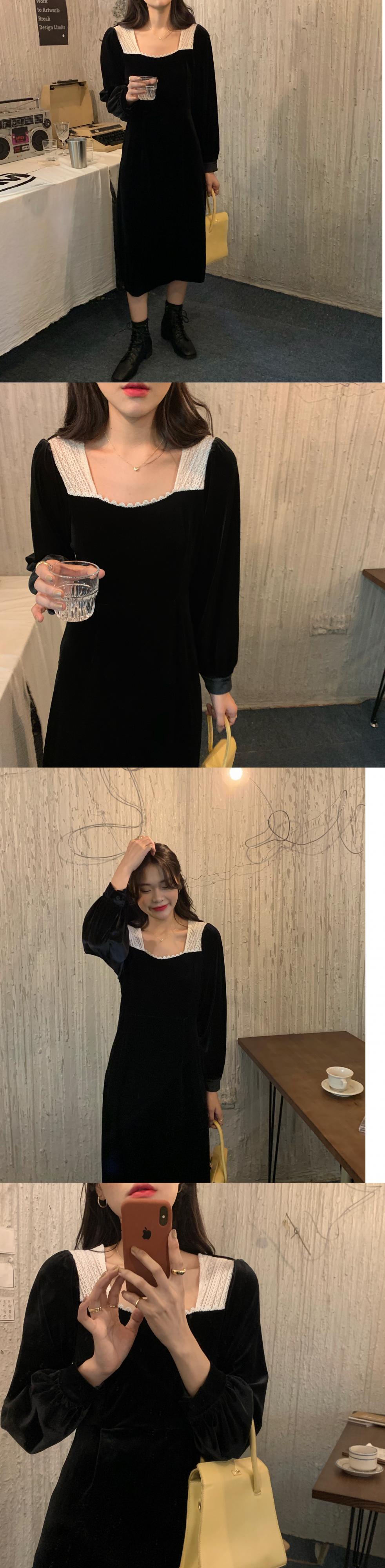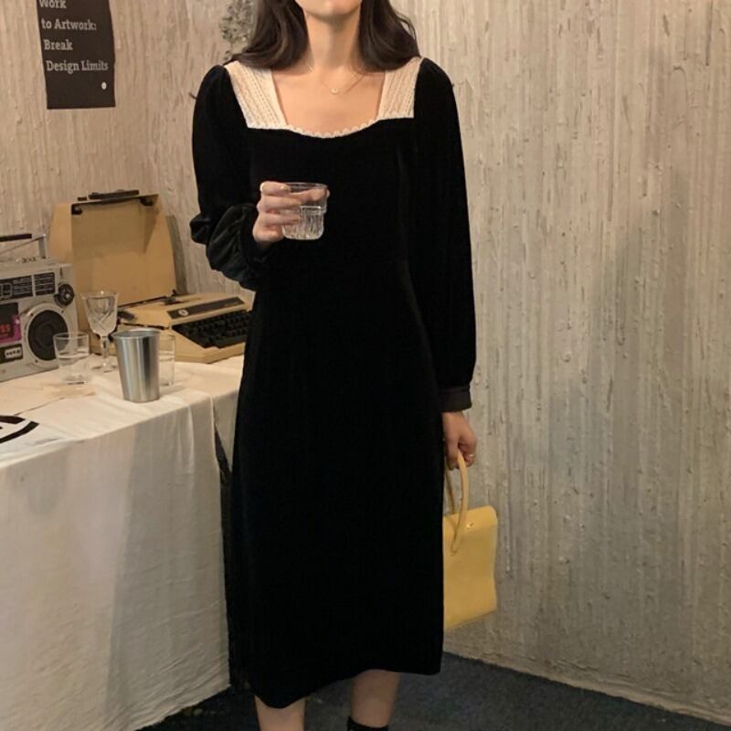 オータムスタンダードスタイルベルベットブラックドレス レース ロング レトロ 秋物 ICC_レディース93840469377