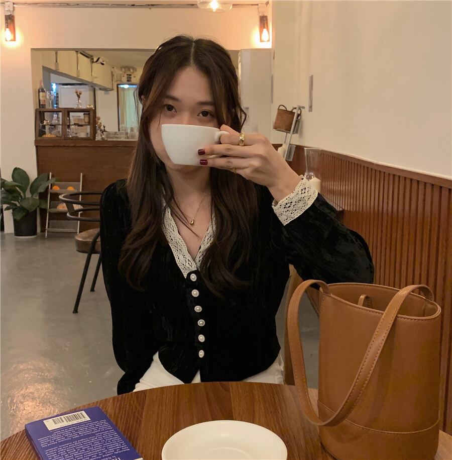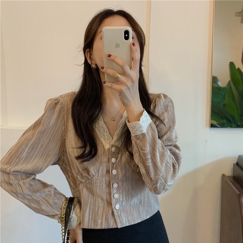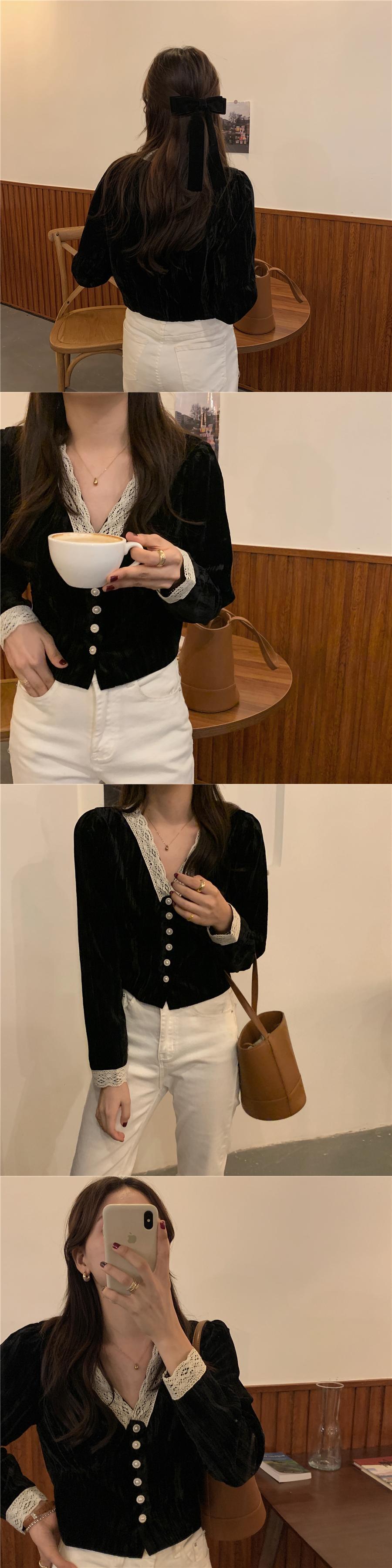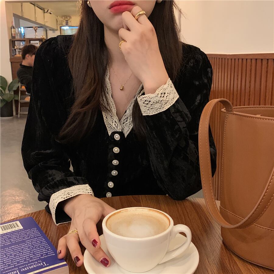 オータムウィンタースタイルVネックゴールドベルベットブラウス シャツ レース 秋物 冬物 ICC_レディース97993043570