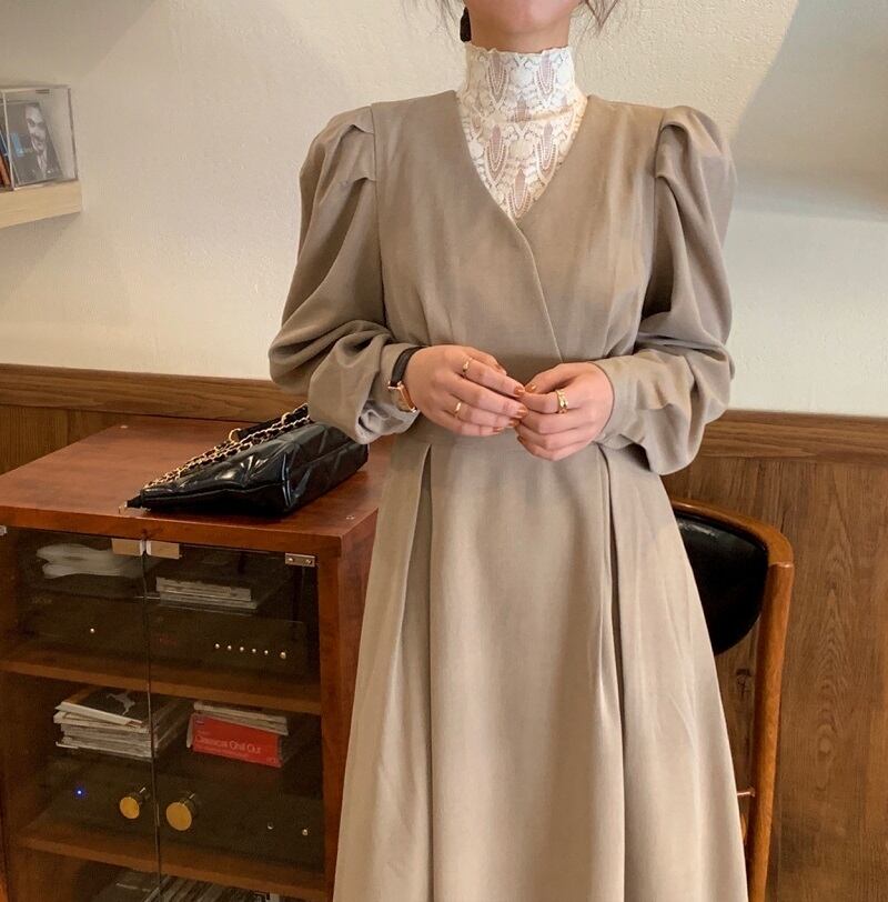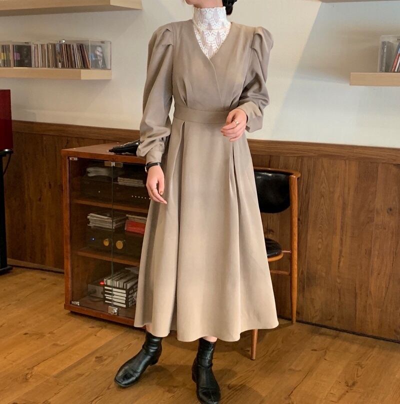スタンダードレースカラーハイウェストウェストスリーブスカート ドレス レトロ ステッチ ICC_レディース71681600988