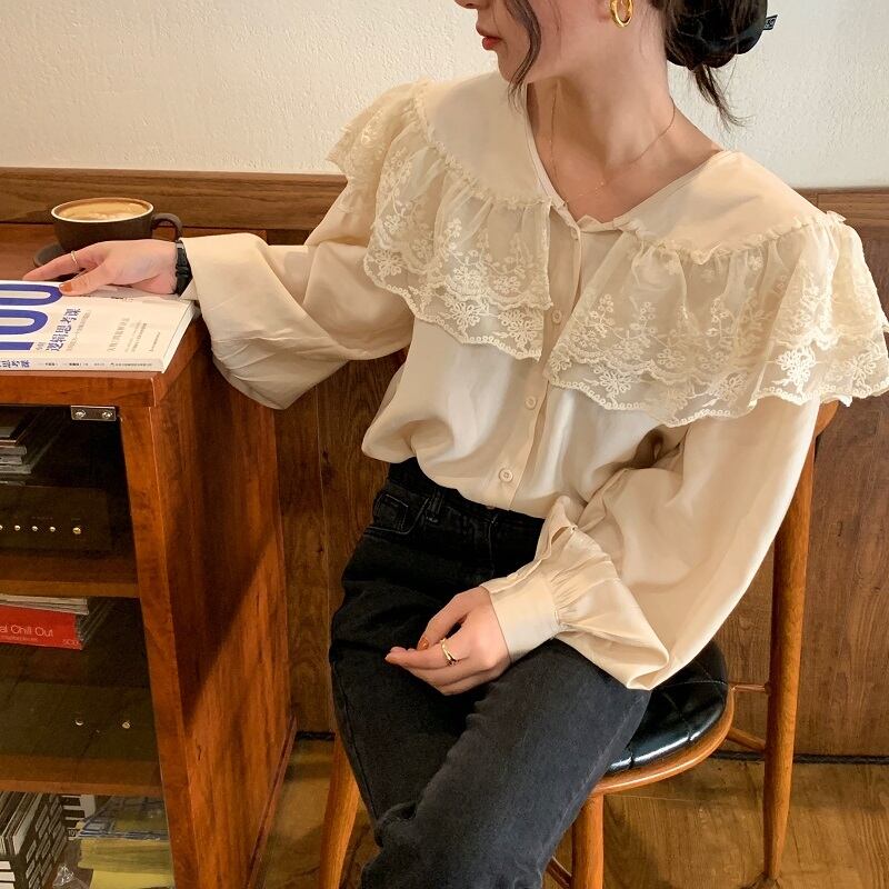 レースFlowerデザイン Vネックルーズ薄手シャツ ロング 大人ガーリー スウィート キュート カジュアル フラワーデザイン ICC_レディース95403076688
