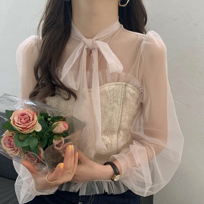スプリングスタンダードFlowerデザイン メッシュシャツ リボン レトロ エレガント 春物 フラワーデザイン ステッチ ICC_レディース5825807550