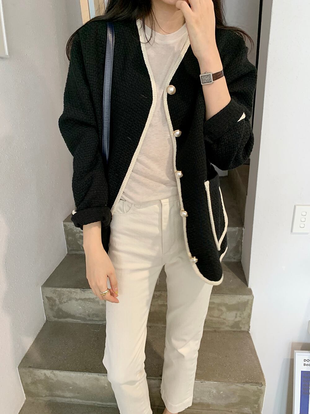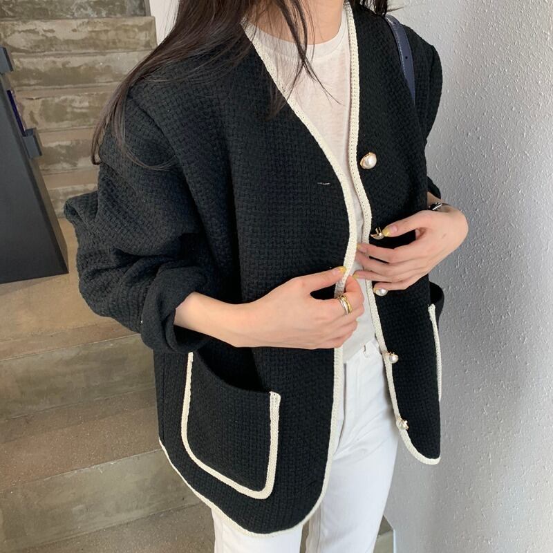 オータムスタンダードVネックカラーパールバックルルーズツィードコート レディース レトロ 秋物 真珠 ICC_レディース6566962