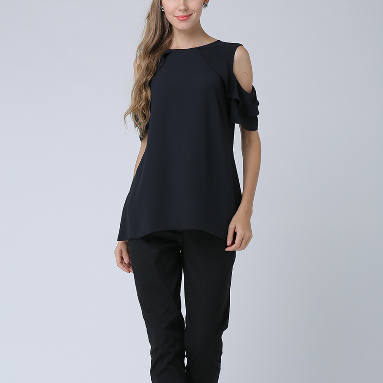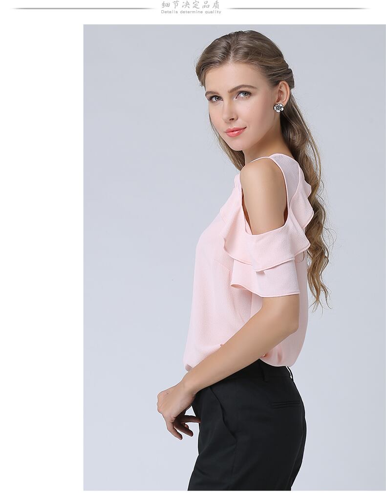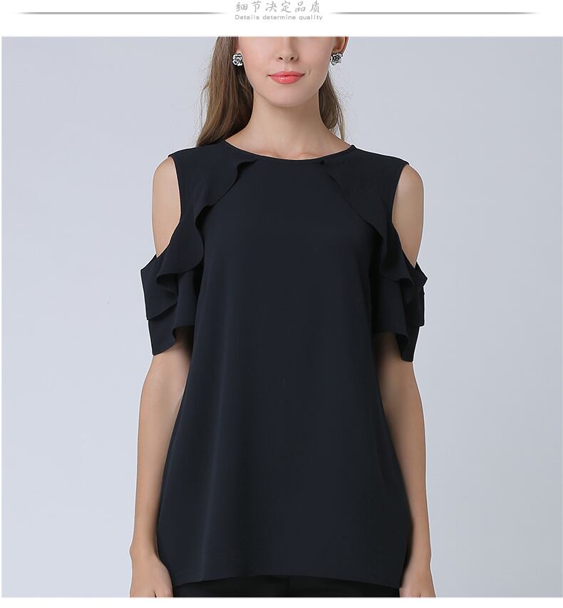 リーキーショルダーブラックシフォンシャツ半袖トップサマーウィメンズハイエンドホローロータスリーフスリーブスモールシャツピンクルーズショルダーカットシャツ 夏物 千款48960125418