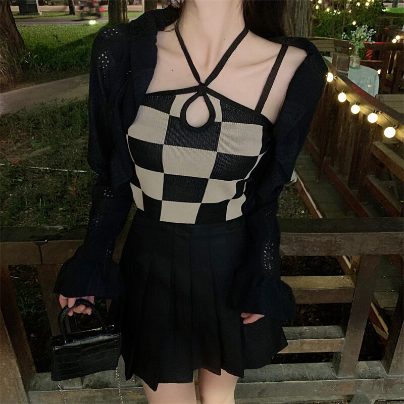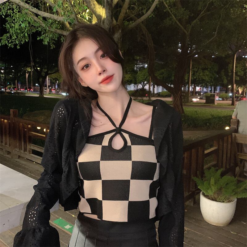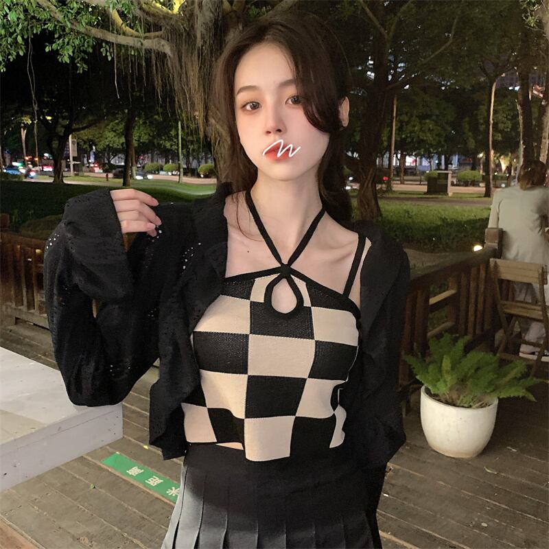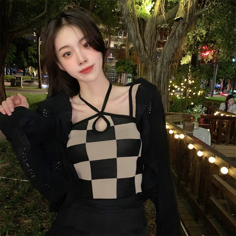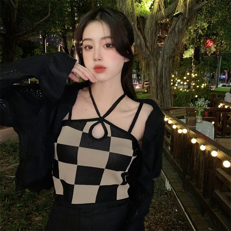 スリングはネットセレブ爆発スタイルの外で着用されています2021年秋新しい注意深いデザインセンスチェック柄レトロベストトップ婦人服 オータム 秋物 可可里97644352673