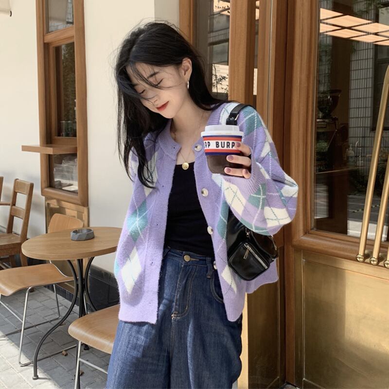 秋バージョン2021新しいスリムファッションオールマッチダイヤモンドグリッドコントラスト気質長袖カーディガンセータージャケット女性 ロング オータム 秋物 可可里58740589526