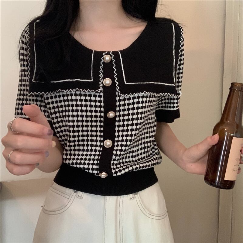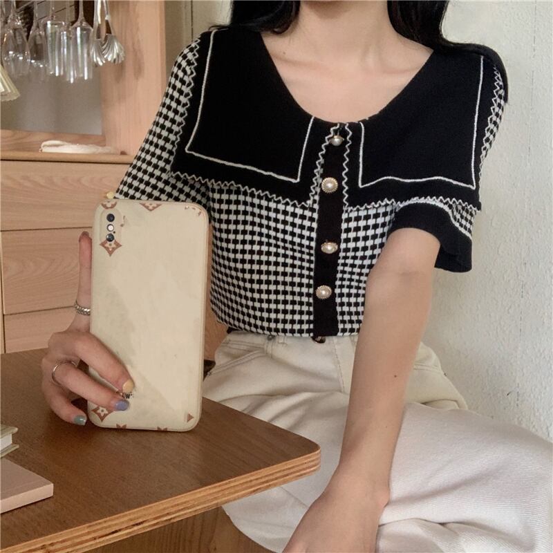 小さな香りのニットセーター女性のデザインセンスチェック柄コントラストカラー大きな襟2021年夏新しい薄い半袖トップタイド サマー 夏物 可可里90608907013