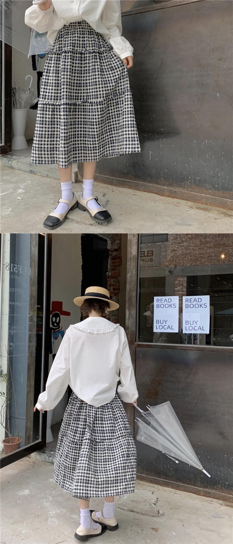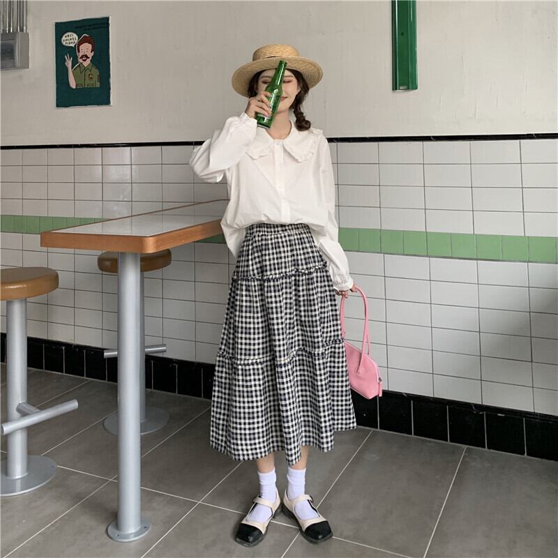 色:チェック柄スカート,白のシャツ