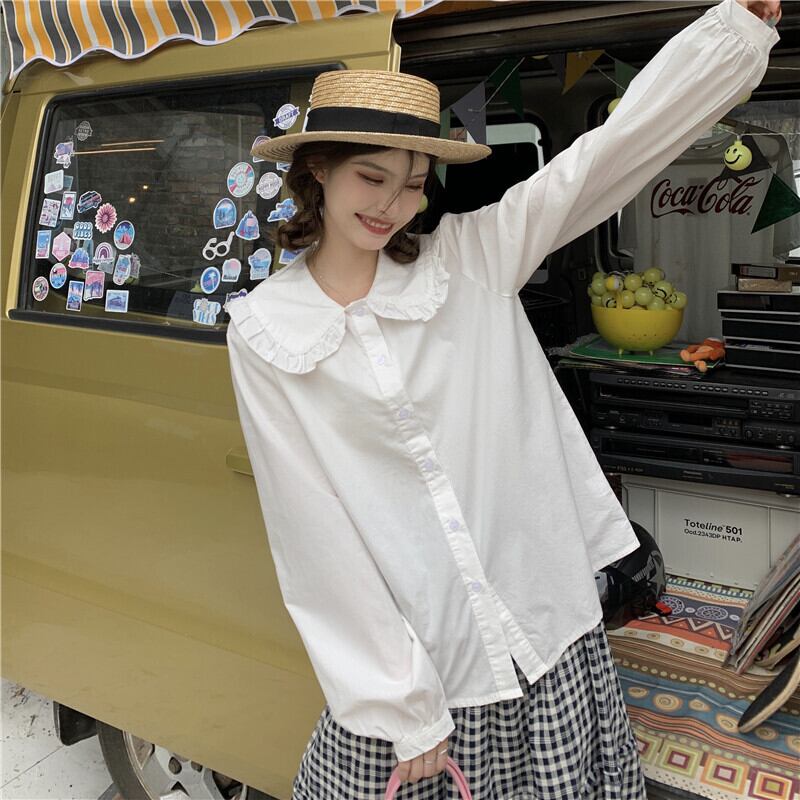 ドールカラーシャツレディースウエスタンスタイル年齢を減らす2021年秋新しいフレンチデザイン、薄手のスタイル、長袖の白いシャツ ロング ホワイト オータム 秋物 可可里57884209521