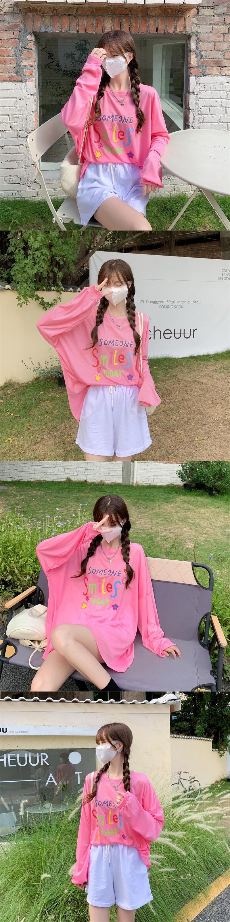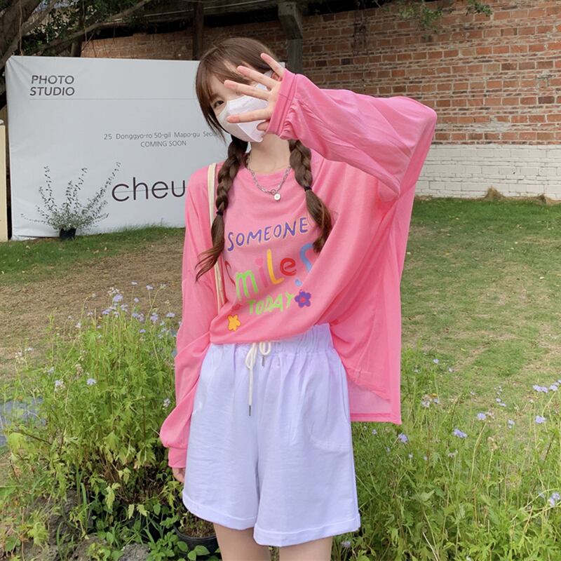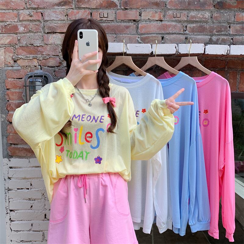長袖日焼け止めシャツ2021年夏新しい甘くて年齢を減らす落書きの手紙薄片マイクロ透明エアコンTシャツトップ女性 ロング 大人ガーリー スウィート キュート カジュアル サマー 夏物 可可里63915827656