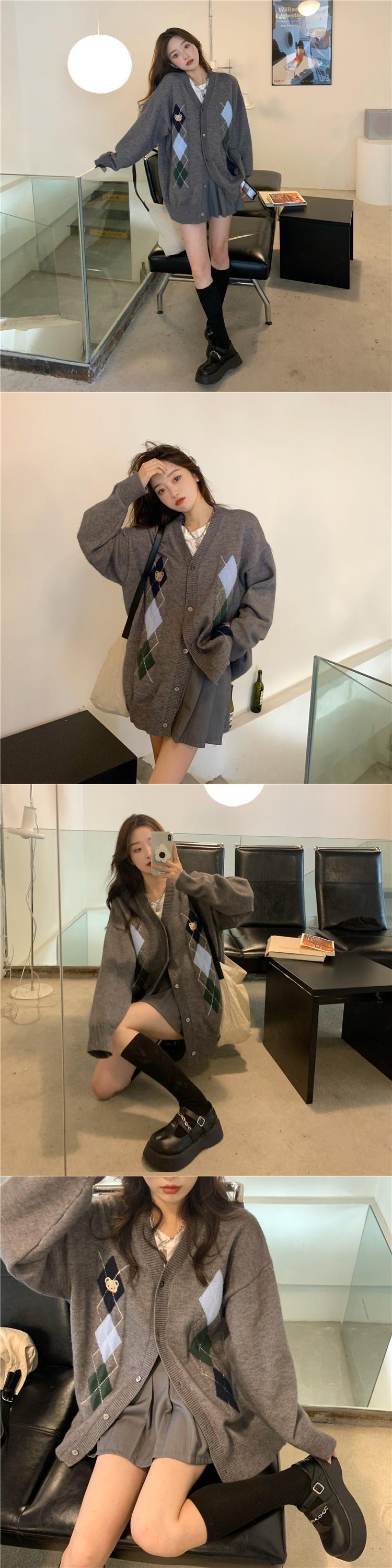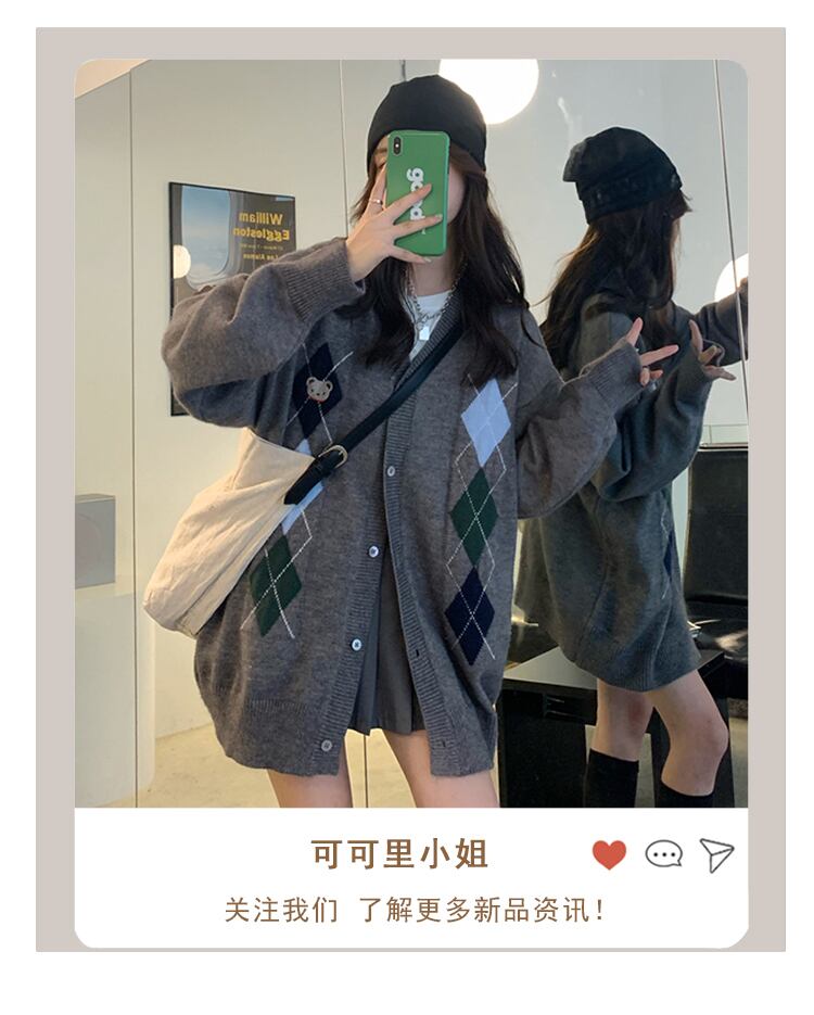 2021年初秋新作コートコントラストカラーひし形ルーズカレッジスタイルVネックスモールセーターニットカーディガン婦人服 オータム 秋物 可可里14474828069