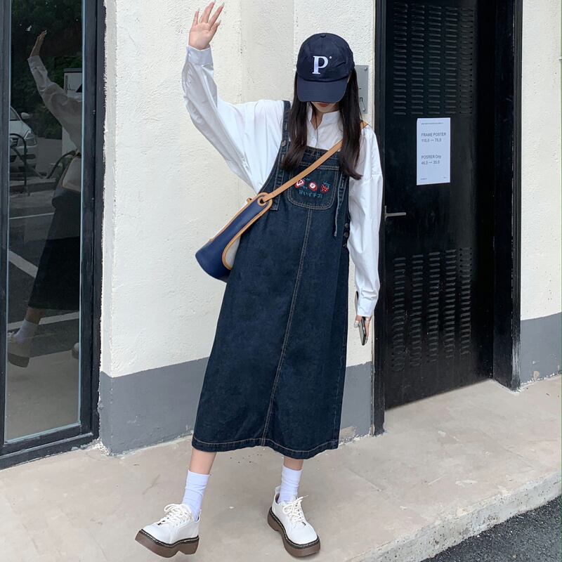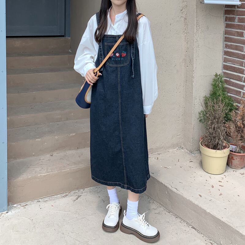 デニムストラップスカート2021年秋新作キュートスカートルーズミドル丈スチューデントドレスレディースイン 大人ガーリー スウィート カジュアル オータム 秋物 可可里13921236473