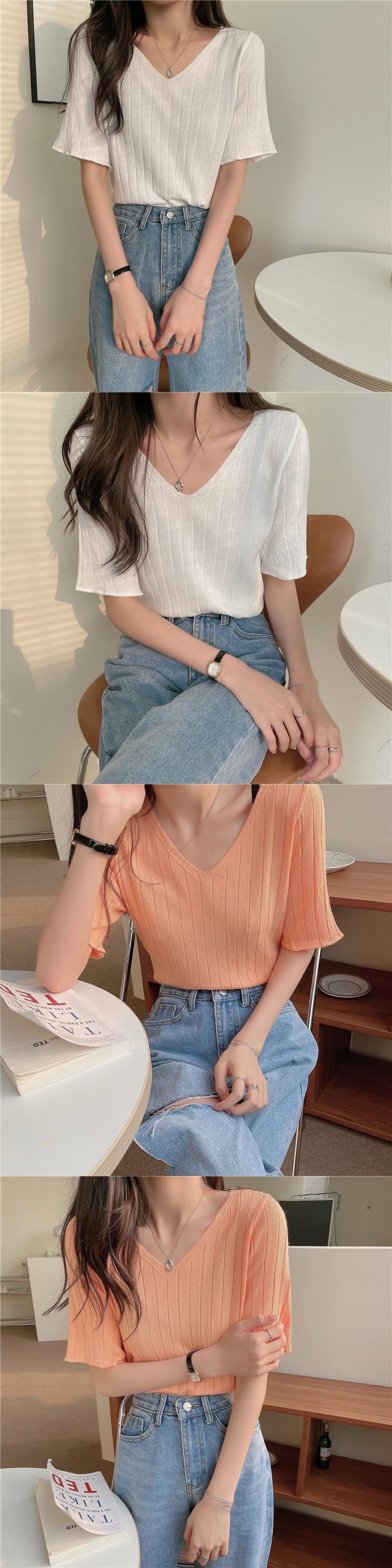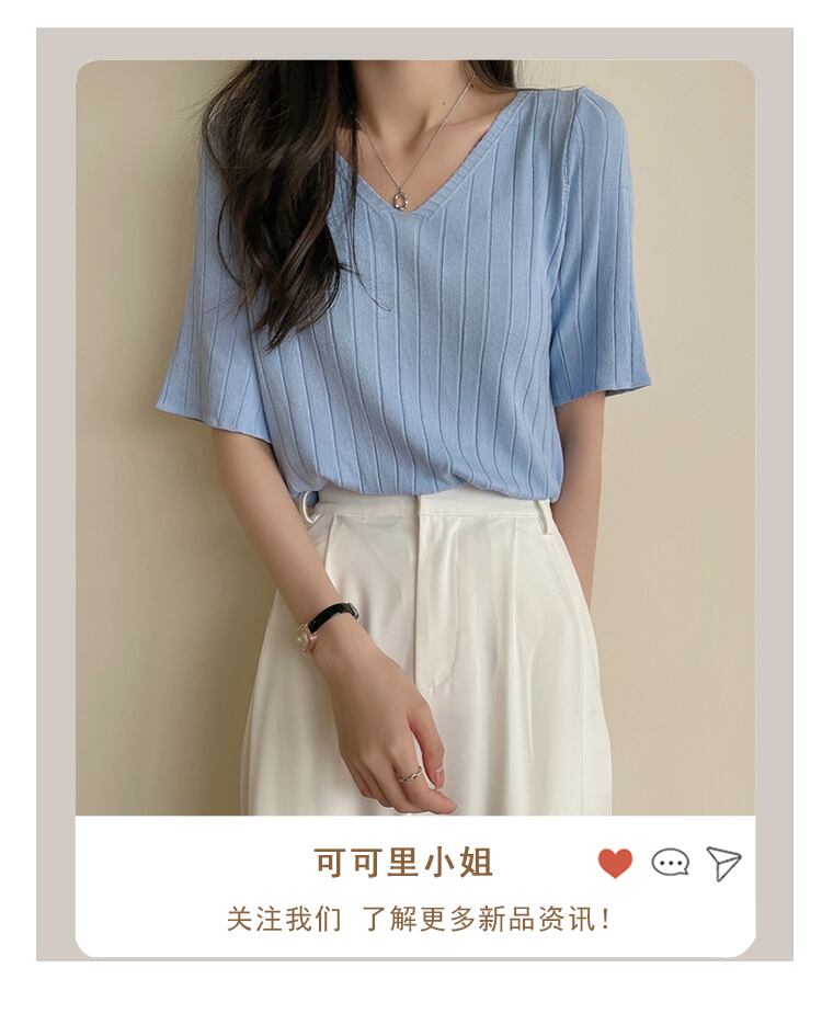 ソフトミルクブルーブラウス2021年夏新しいルーズシンセクションシンセクションVネックピットストライプショートセクション半袖セーター女性 サマー 夏物 可可里74443688599