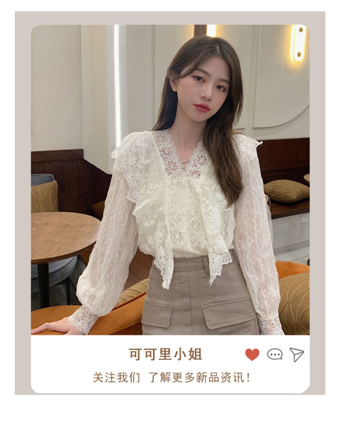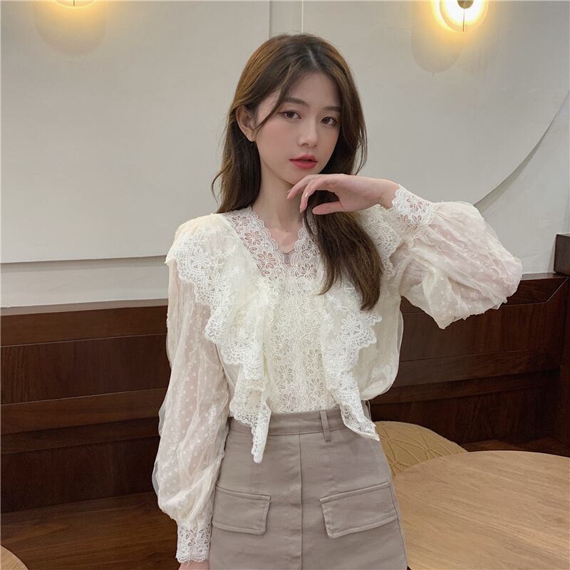 2021年秋新作フレンチルーズ長袖デザインセンスフリル中空Vネックレースブラウスレディース ロング オータム 秋物 可可里49267102676