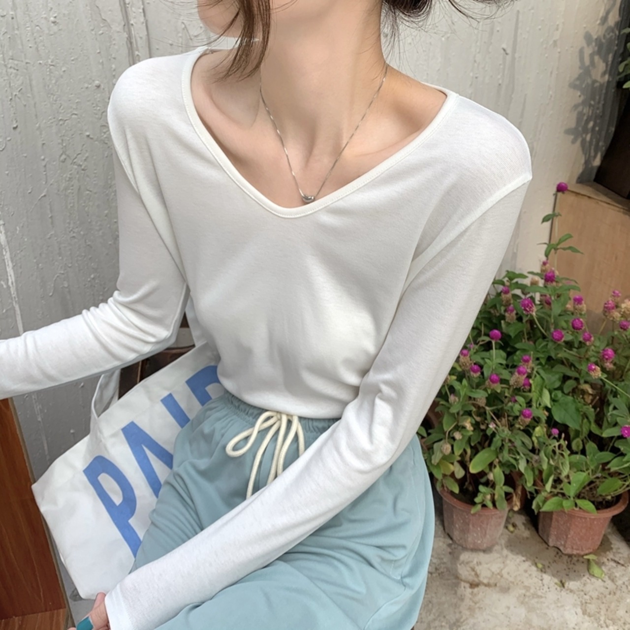 ピュアカラー初秋Vネックワンピース2021年新作ファッションインインナーベースシャツレディース春秋長袖Tシャツ ロング スプリング 春物 オータム 秋物 可可里57942857162
