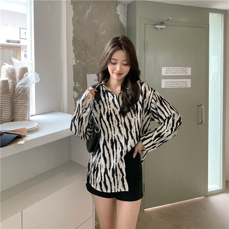 2021年夏の新しいレトロな香港スタイルのデザインルーズミドル丈ゼブラパターン日焼け止め長袖シャツトップ女性 ロング サマー 夏物 可可里87214911726