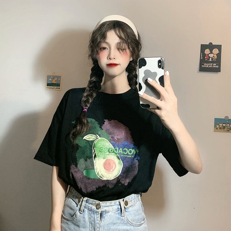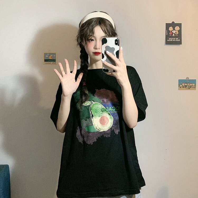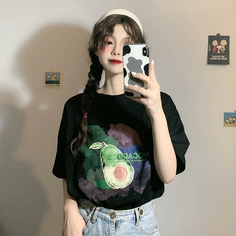 Tシャツ半袖ルーズサマー2021新しいレトロ文学アボカドBF風ニッチ甘くてクールな黒のトップ女性 ブラック 大人ガーリー スウィート キュート カジュアル 夏物 可可里83024999672