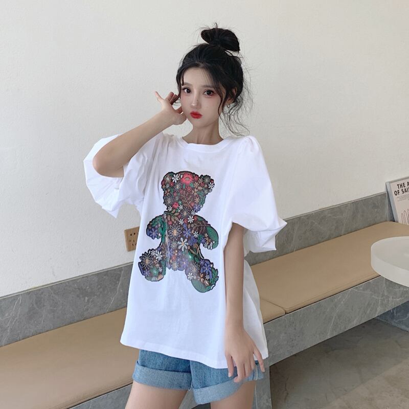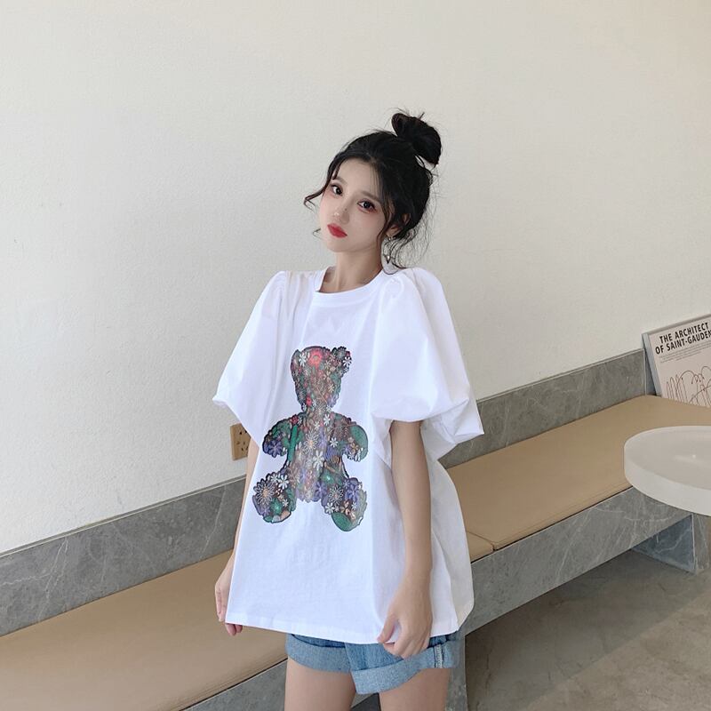 ランタンスリーブホワイトTシャツ女性デザインセンス2021年夏新作クマシックスモールシャツルーズバージョン半袖トップス サマー 夏物 可可里36623444940