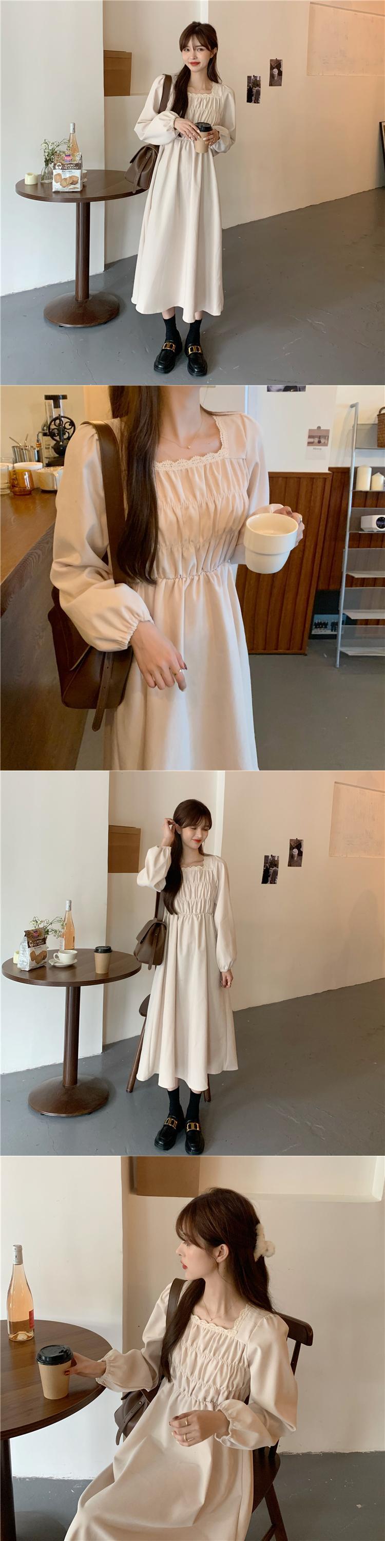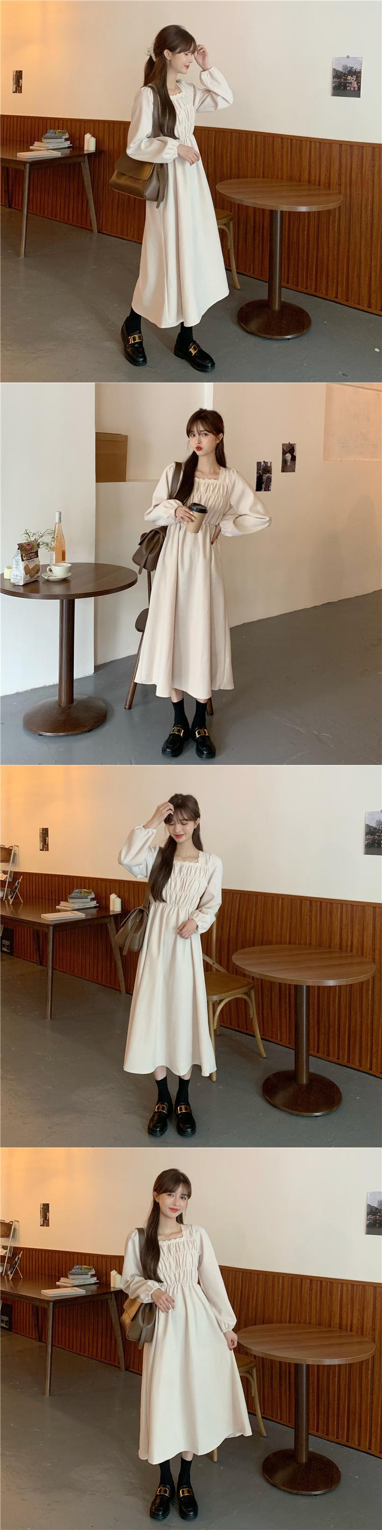 2021年秋バージョンの新しいファッションシックなフランスの年齢を減らすスクエアカラースリミングフォールドウエスト長袖ドレス女性 ロング オータム 秋物 スクウェア 可可里15598916582