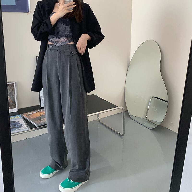 グレーパンツスーツパンツ2021年初秋新ハイウエストドレープ薄切片ワイドレッグストレートカジュアルパンツ女性インタイド ハイウェスト オータム 秋物 可可里98533940571