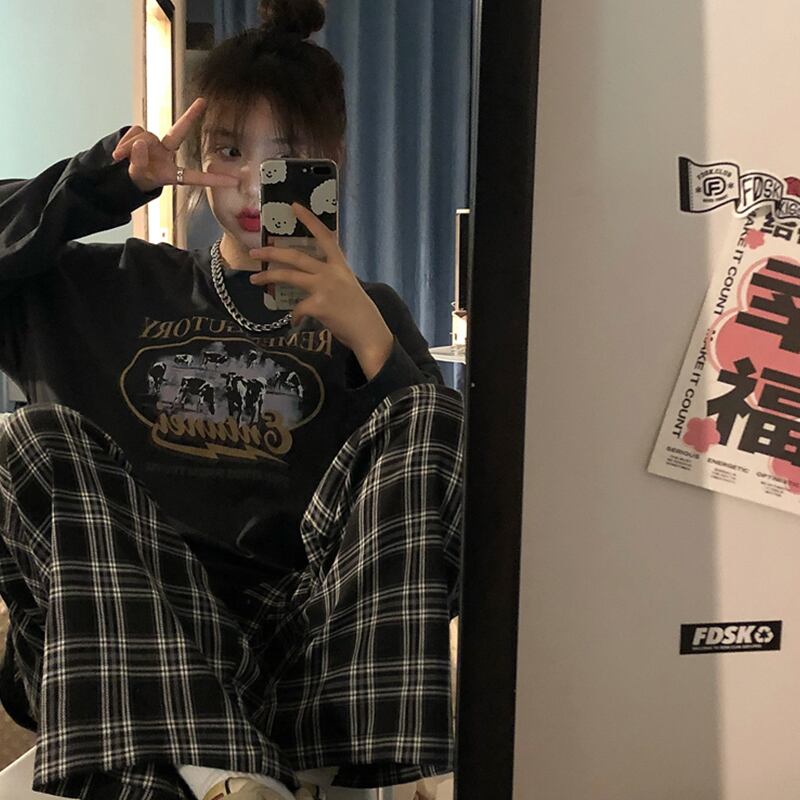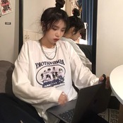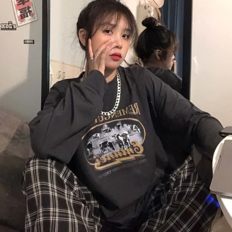 2021年春秋新作レトロ香港スタイルルーズミドル丈ヴィンテージレタープリント長袖Tシャツトップ婦人服 ロング スプリング 春物 オータム 秋物 ビンテージ 可可里71017301499