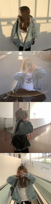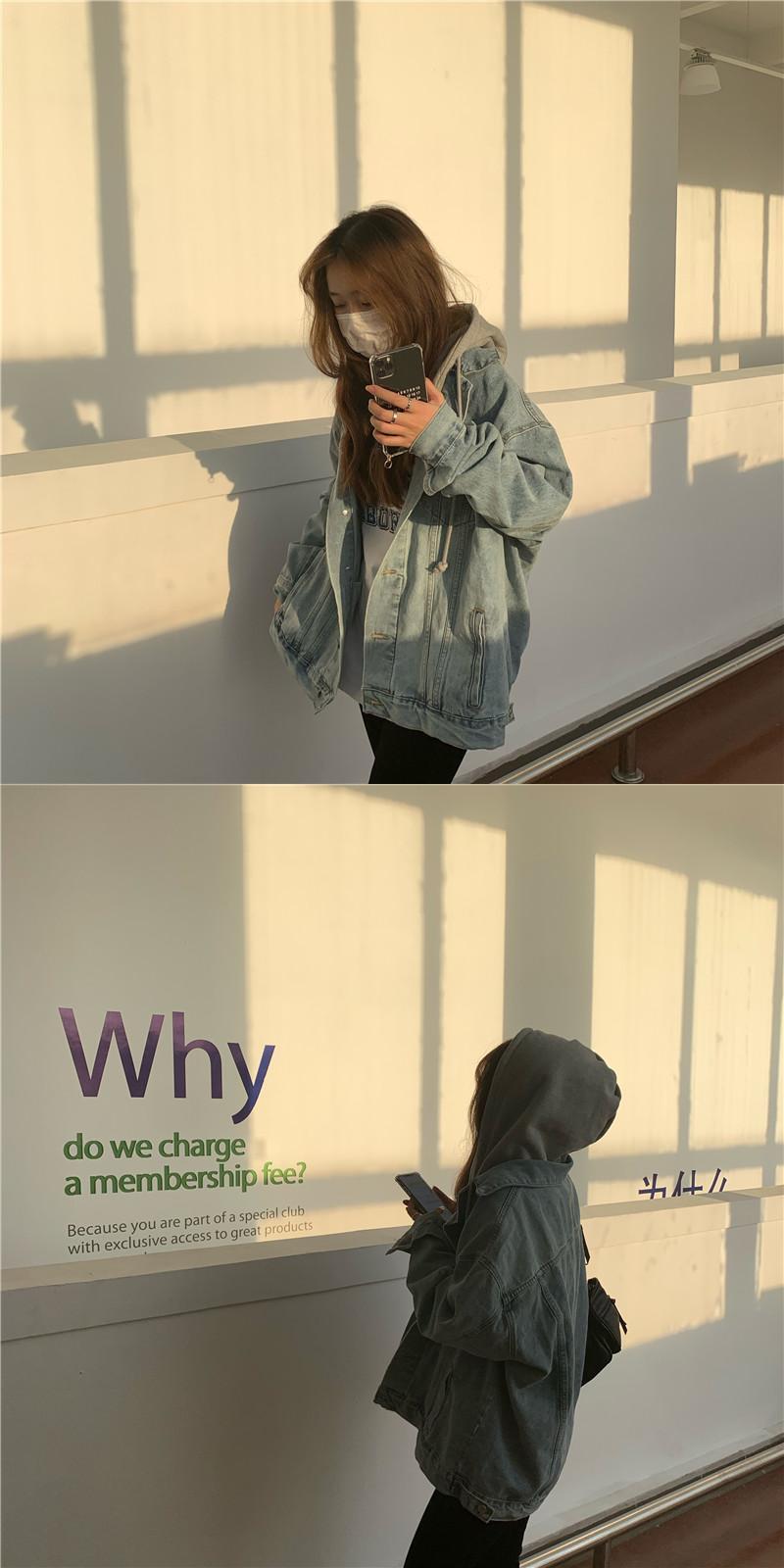 2021年秋バージョンの新しいフェイクツーピースフード付きデニムミドル丈ルーズカジュアル長袖ジャケットイントレンディな女性 ロング オータム 秋物 可可里5767004660