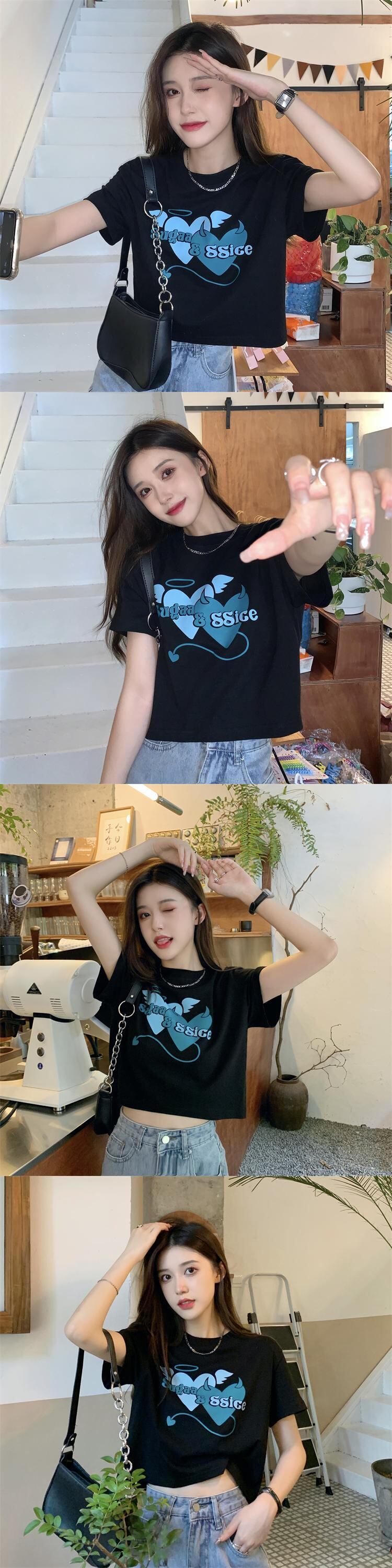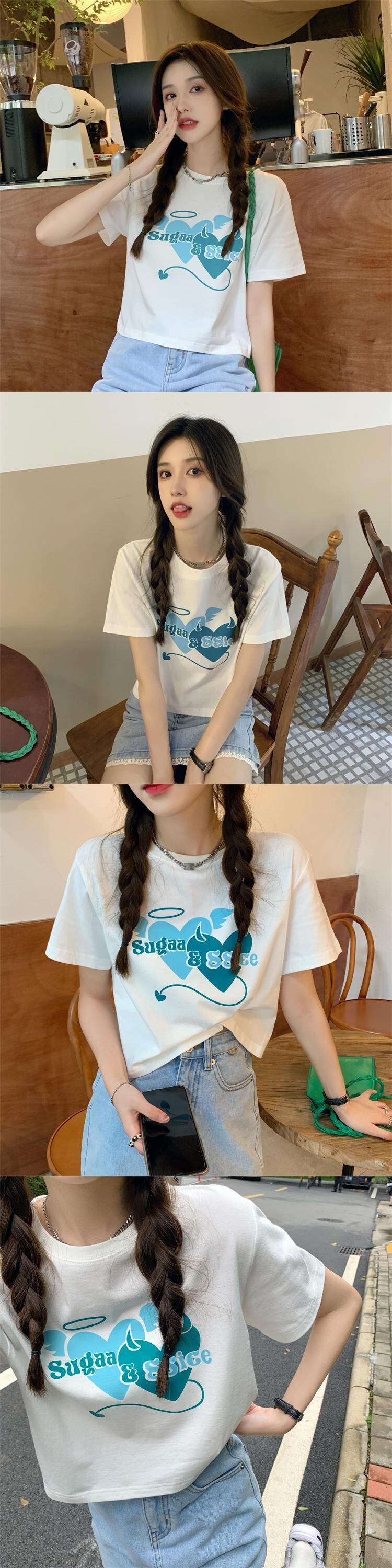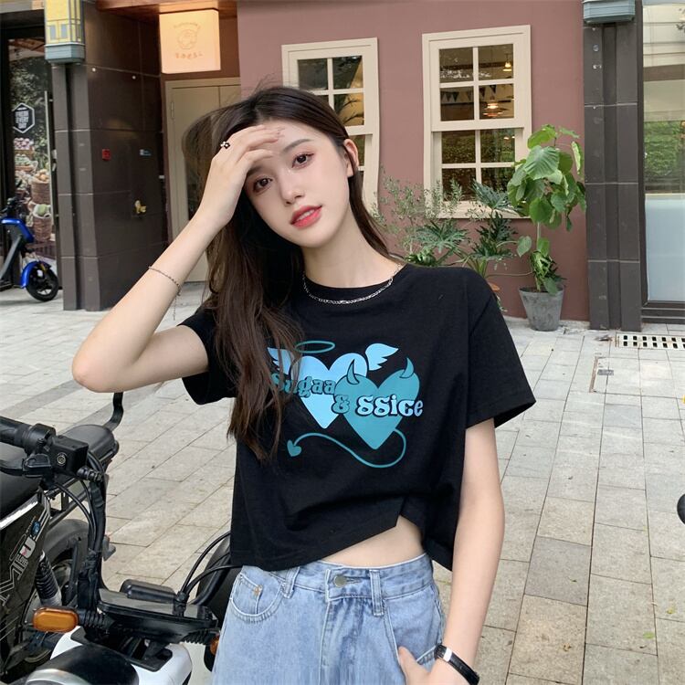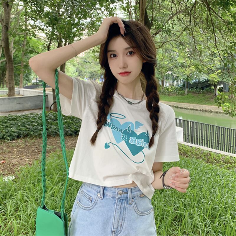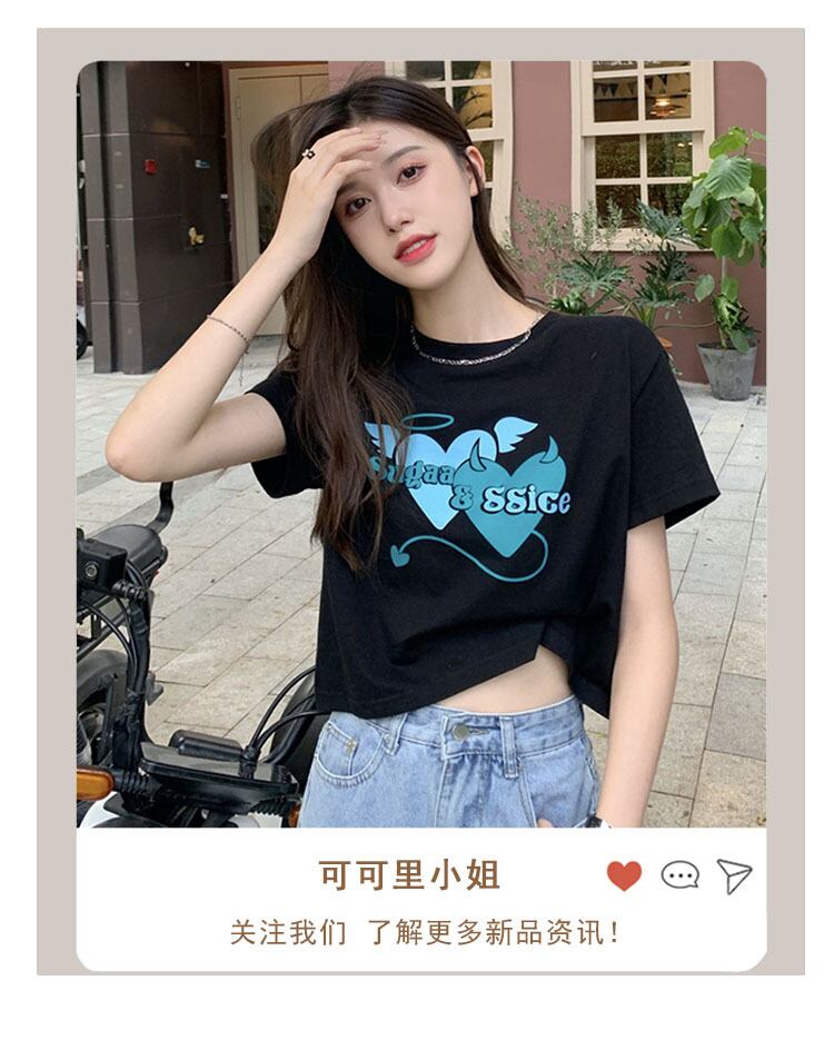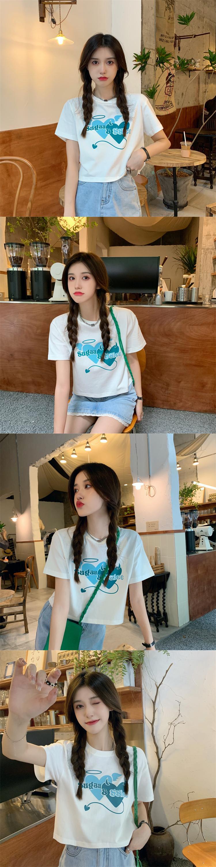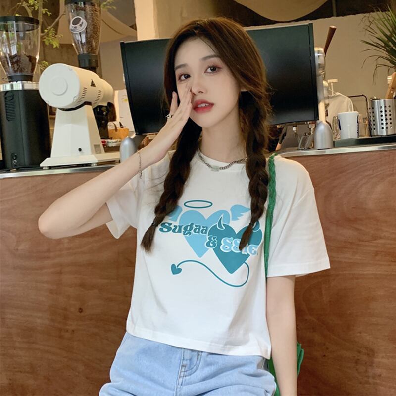 甘くてスパイシーなトップラブプリントショートサマーバージョン2021新しいスリムで薄い半袖Tシャツの女性 大人ガーリー スウィート キュート カジュアル 夏物 可可里65436663670