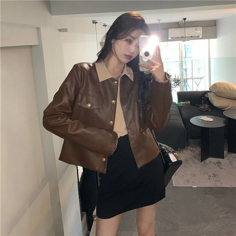 ネットレッドジャケット2021年秋新作アウターウェア機関車POLOカラーハイストリートスタイルソルトレザージャケット婦人服 オータム 秋物 可可里38185894349