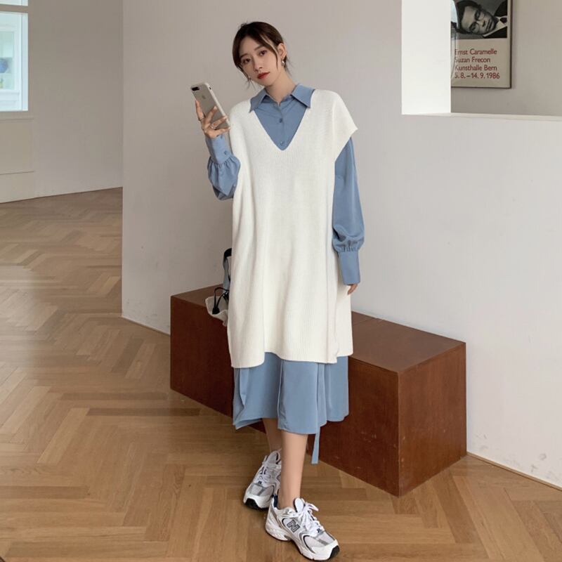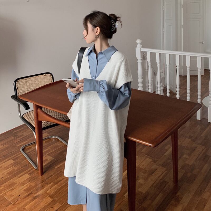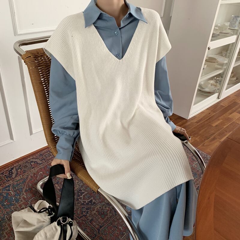 折りたたまれたVネックニットベスト秋バージョン2021新しいルーズミドル丈デザインセンスアウターセーター婦人服 オータム 秋物 可可里46689463794