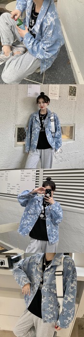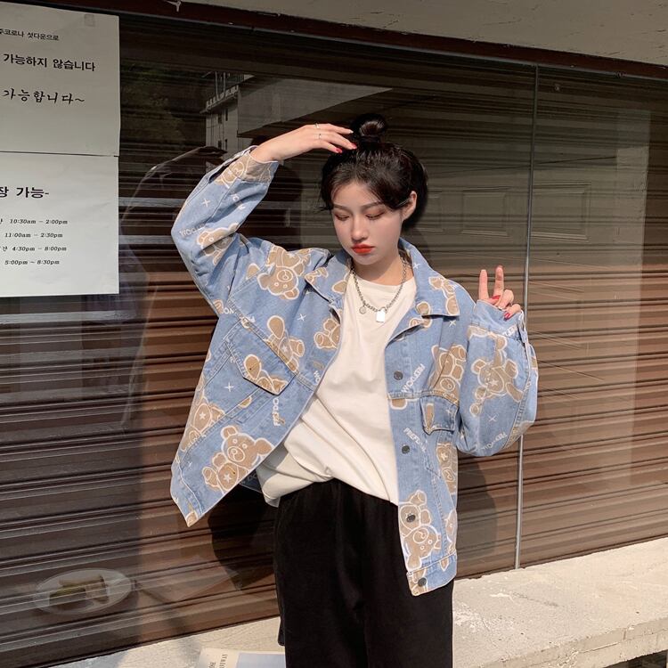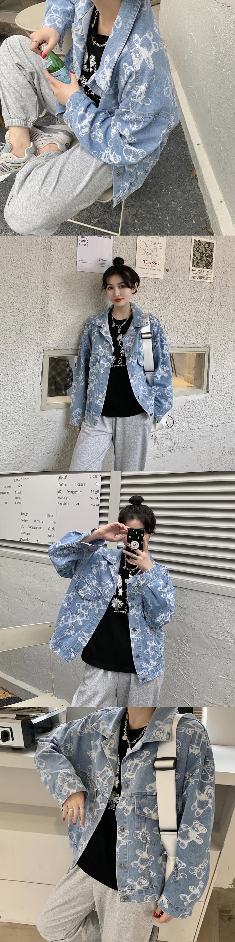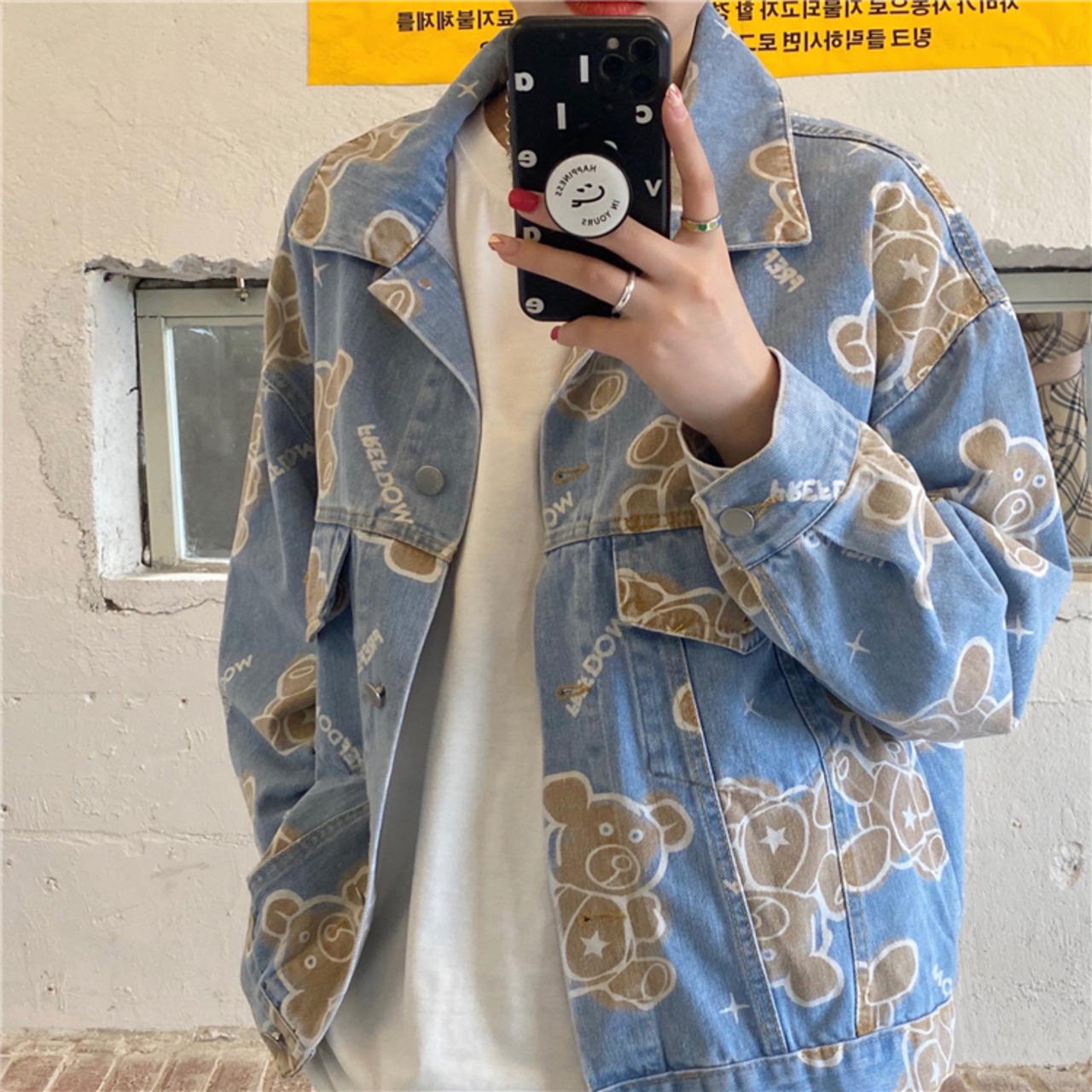 2021年春秋新作レトロ香港スタイルデザインセンスベアプリントスウィートクールウィンドルーズ長袖デニムジャケットレディース ロング 大人ガーリー キュート カジュアル スプリング 春物 オータム 秋物 可可里30605038541