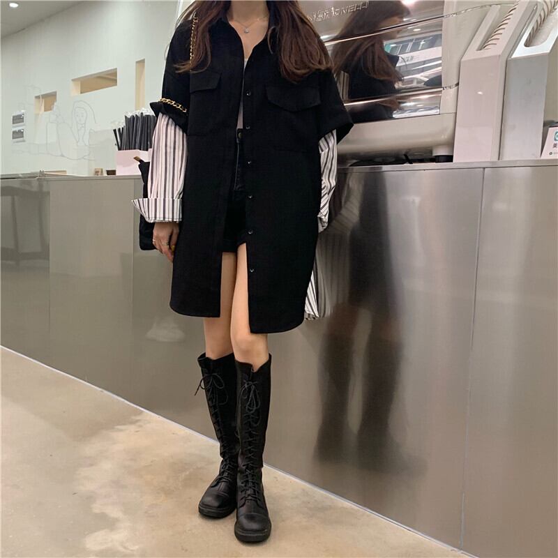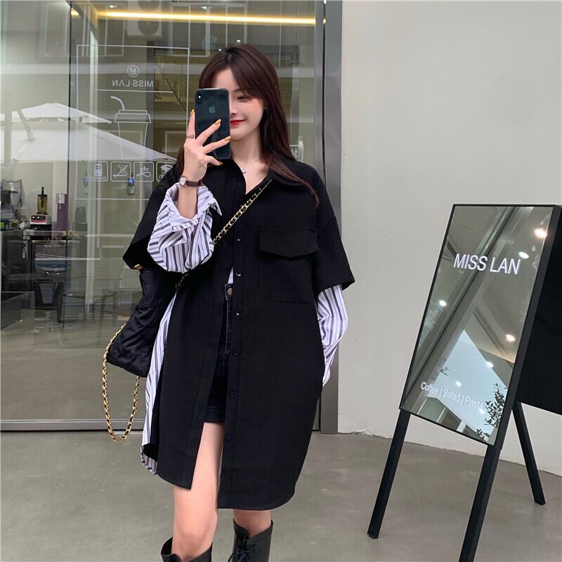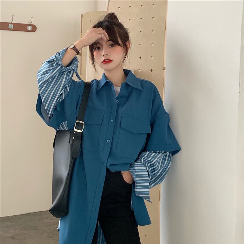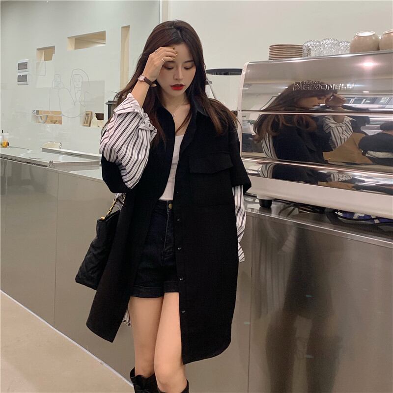 秋のジャケット女性デザインセンスニッチ2021新しいストライプフェイクツーピース長袖シャツジャケットシック ロング オータム 秋物 可可里84904760473