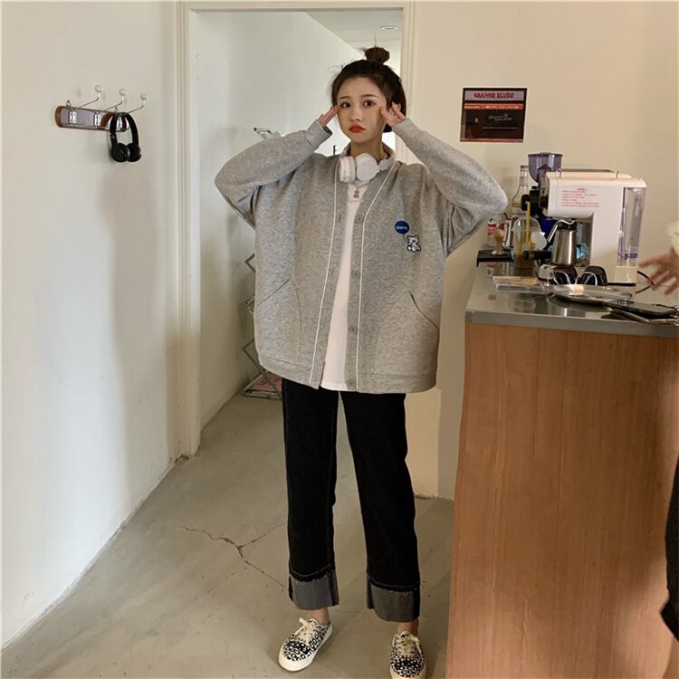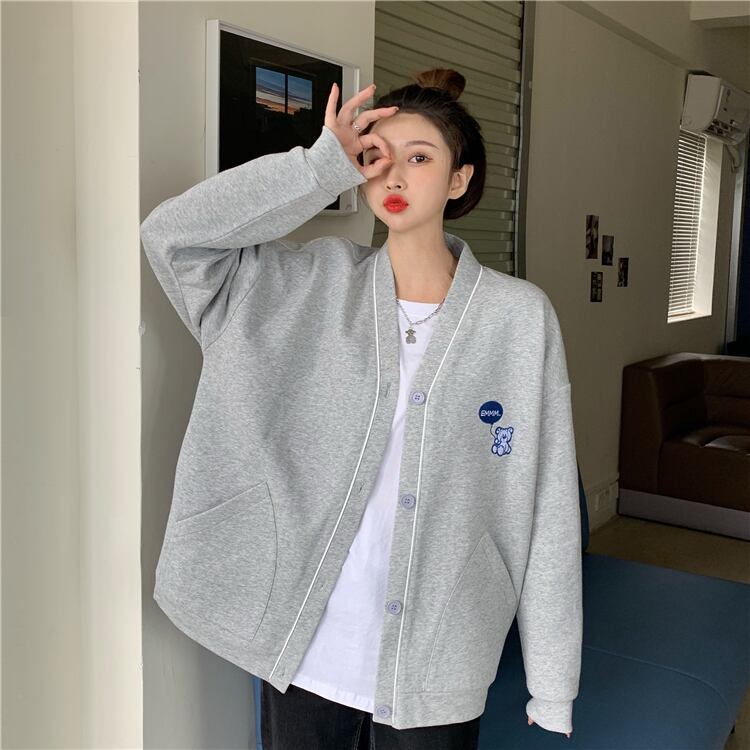 2021年秋新作長袖トップス女性の年齢を減らすカレッジスタイルのルーズVネッククマ刺繡長袖セータージャケット ロング 刺繍 オータム 秋物 可可里76941547712