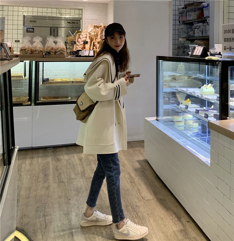 2021年春の新しいカレッジスタイルのネイビーカラー気質コートルーズシンセクションスモール長袖ウールコート女性 ロング スプリング 春物 可可里3600560344