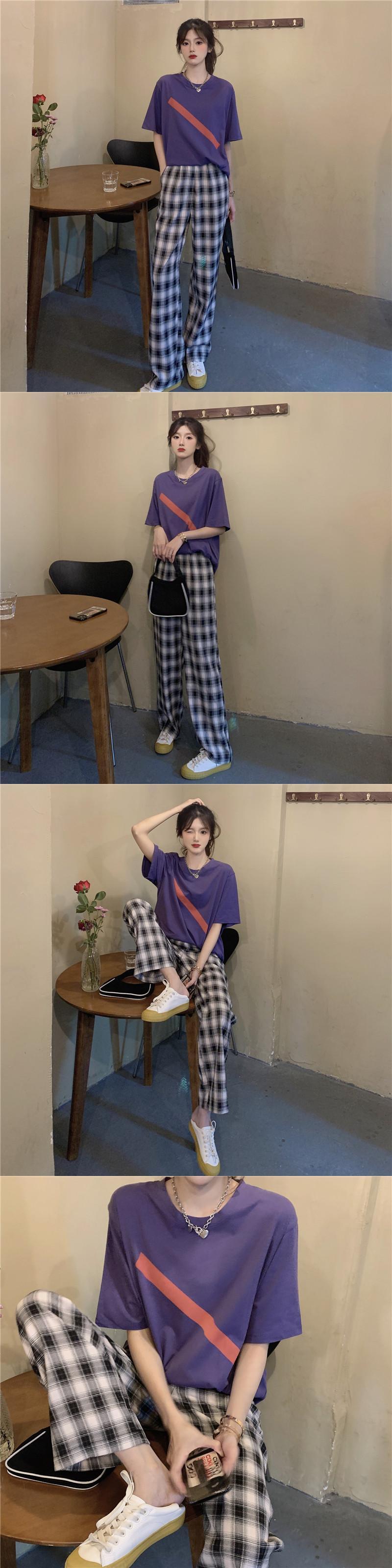 色:紫の半袖,青い半袖,緑の半袖,ピンクの半袖,黒と白のチェック柄パンツ,コーヒーチェックパンツ