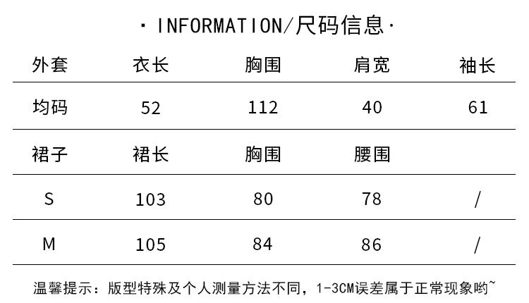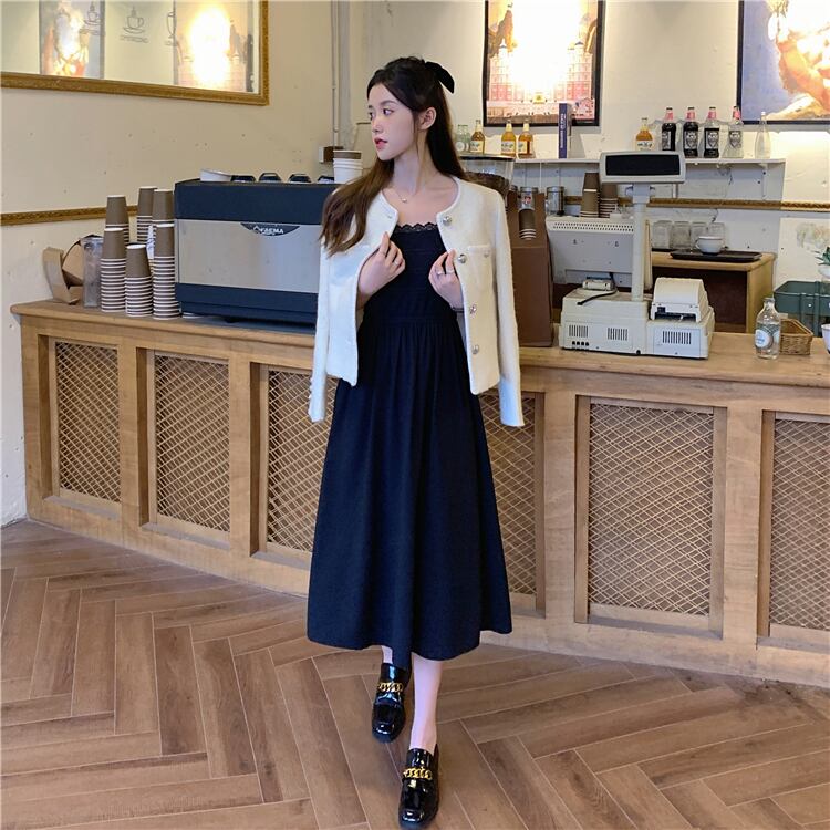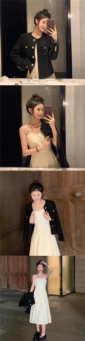 色:黒いジャケット,白いコート,ブラックサスペンダースカート,アプリコットドレス