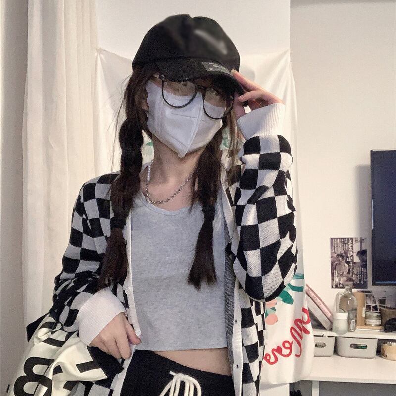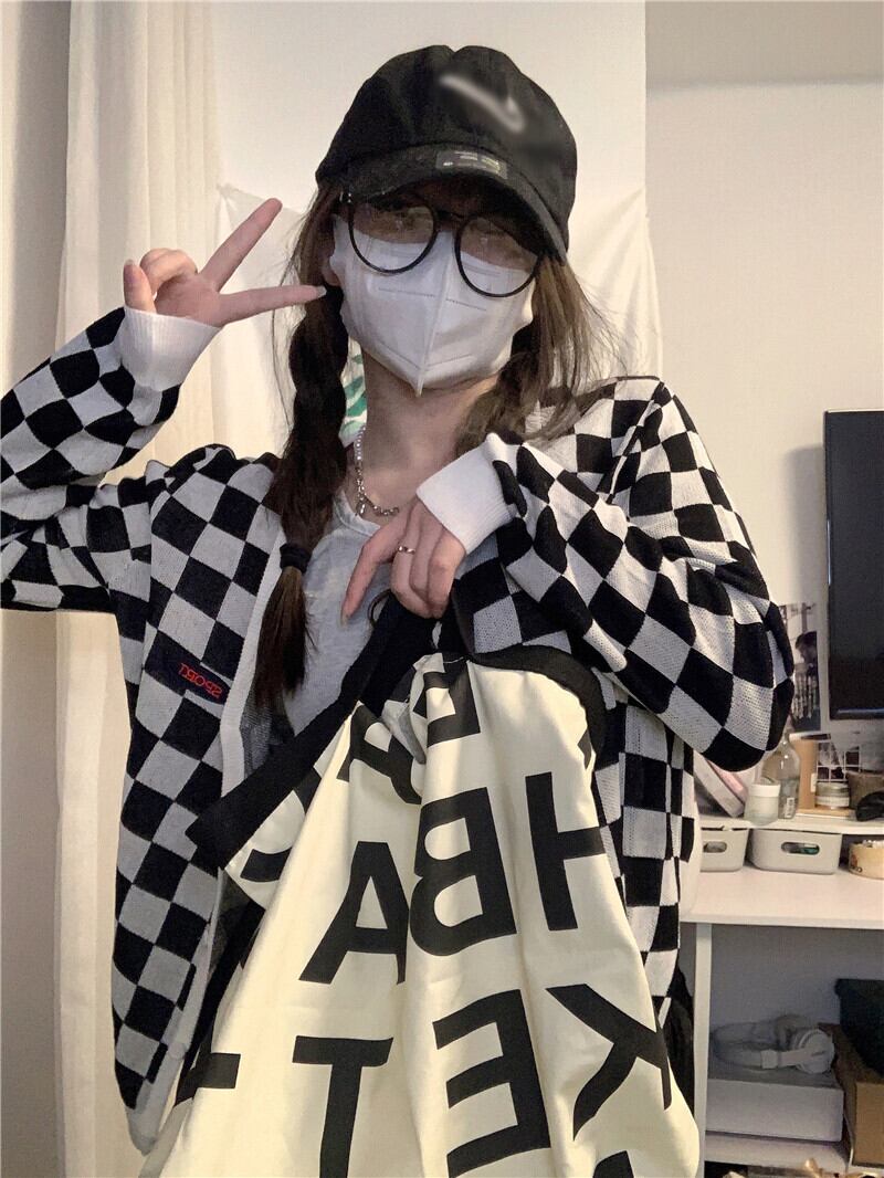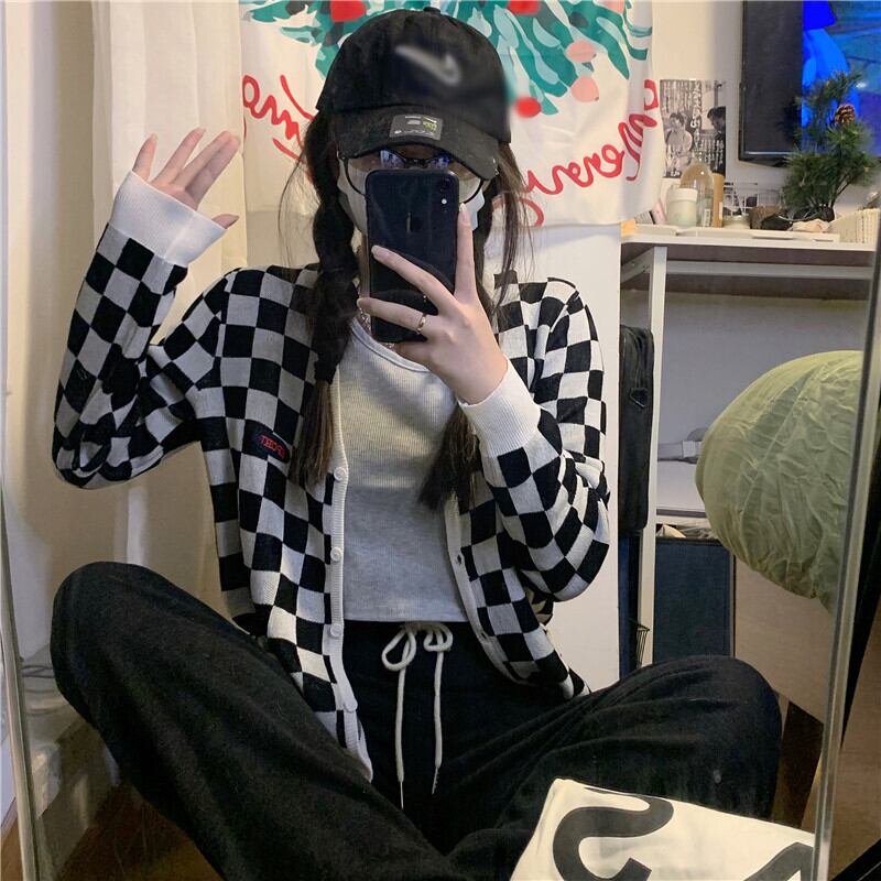 フライドストリートオータムジャケットシンニットセーター2021レトロチェック柄ルーズロングスリーブライトマチュアセーター女性 長袖 秋物 可可里94505436980