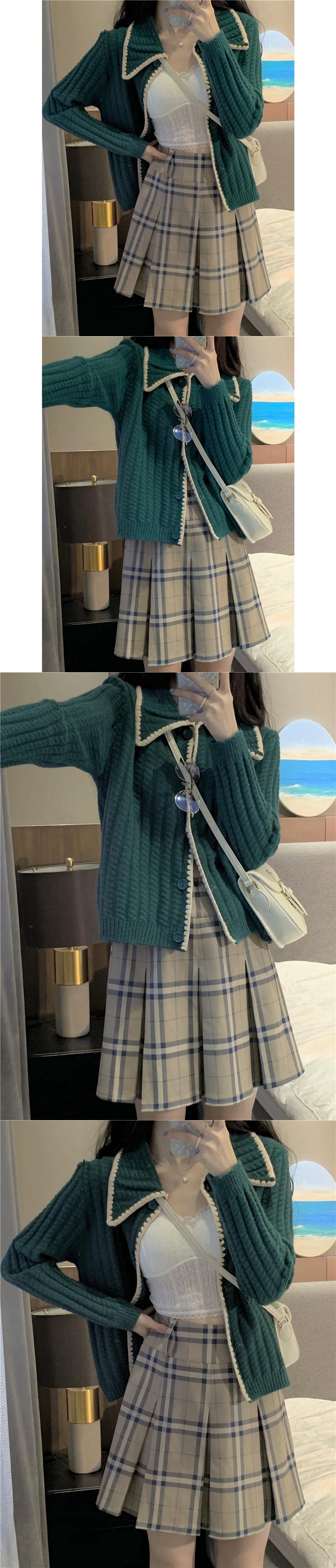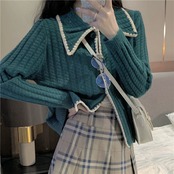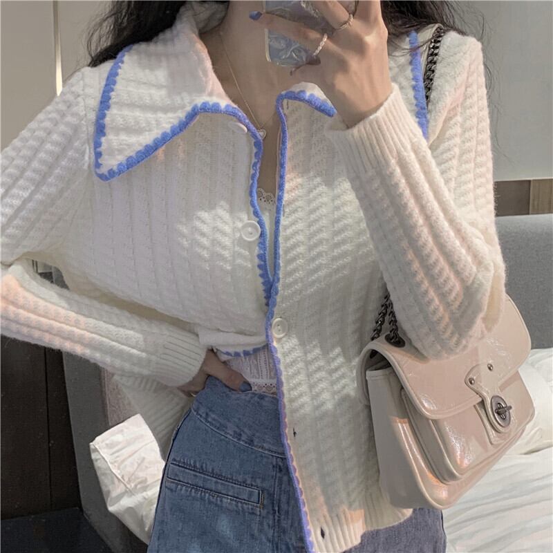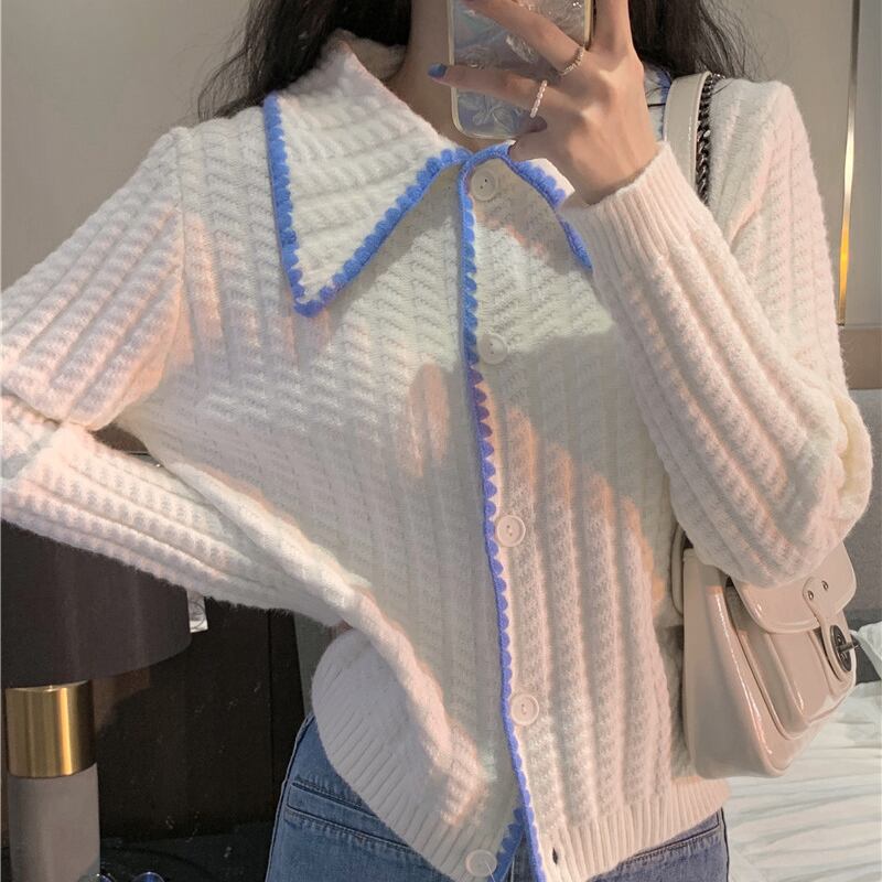 ブルーセーターリトルマン2021年秋新気性トップインドールカラー長袖ニットカーディガンジャケット ロング オータム 秋物 可可里29295674224