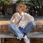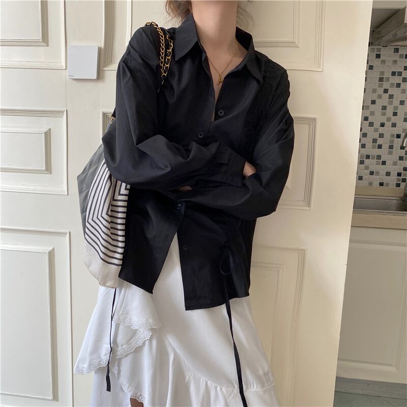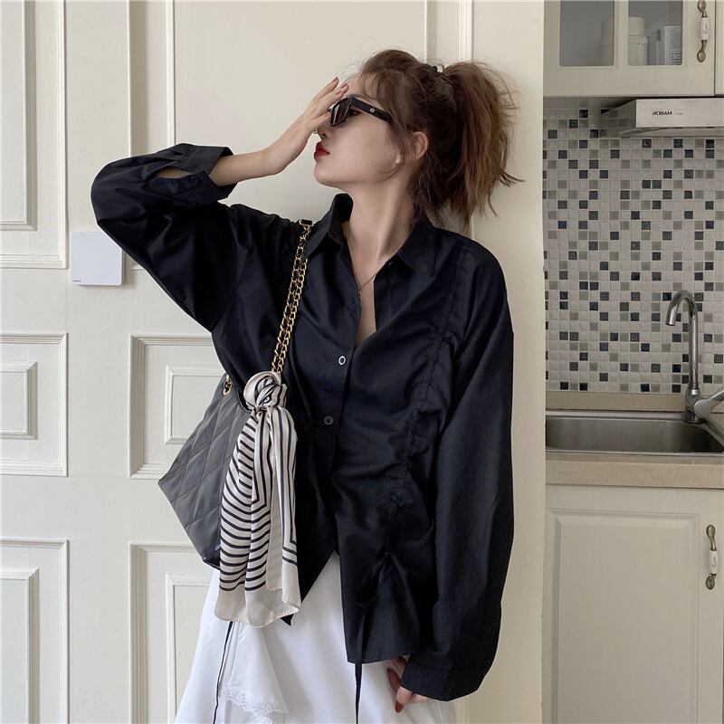 春秋バージョン2021新デザインセンスニッチルーズミドル丈巾着塩長袖シャツトップ婦人服 ロング スプリング 春物 オータム 秋物 可可里30350123429