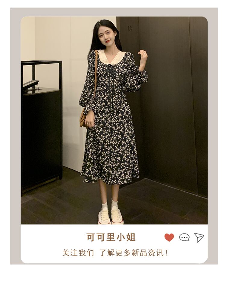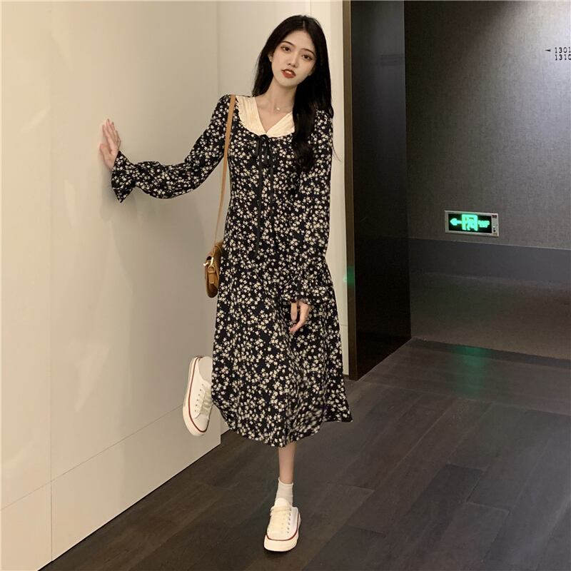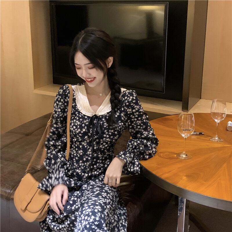 花柄長袖ワンピース2021年秋レトロフレンチウエストウエスト細いAラインスカートレディーススカート ロング 可可里64449899079