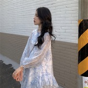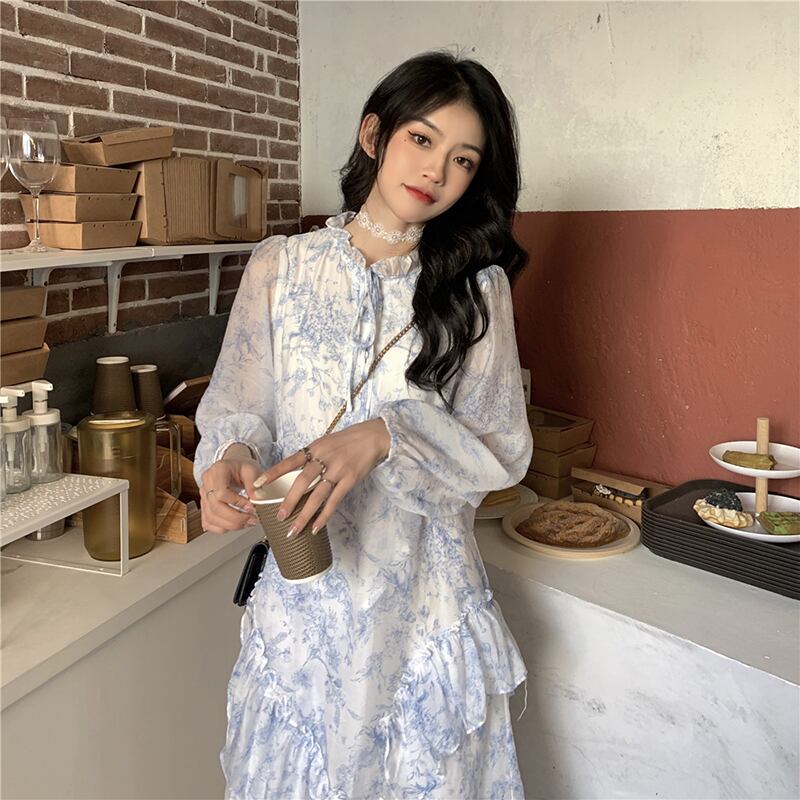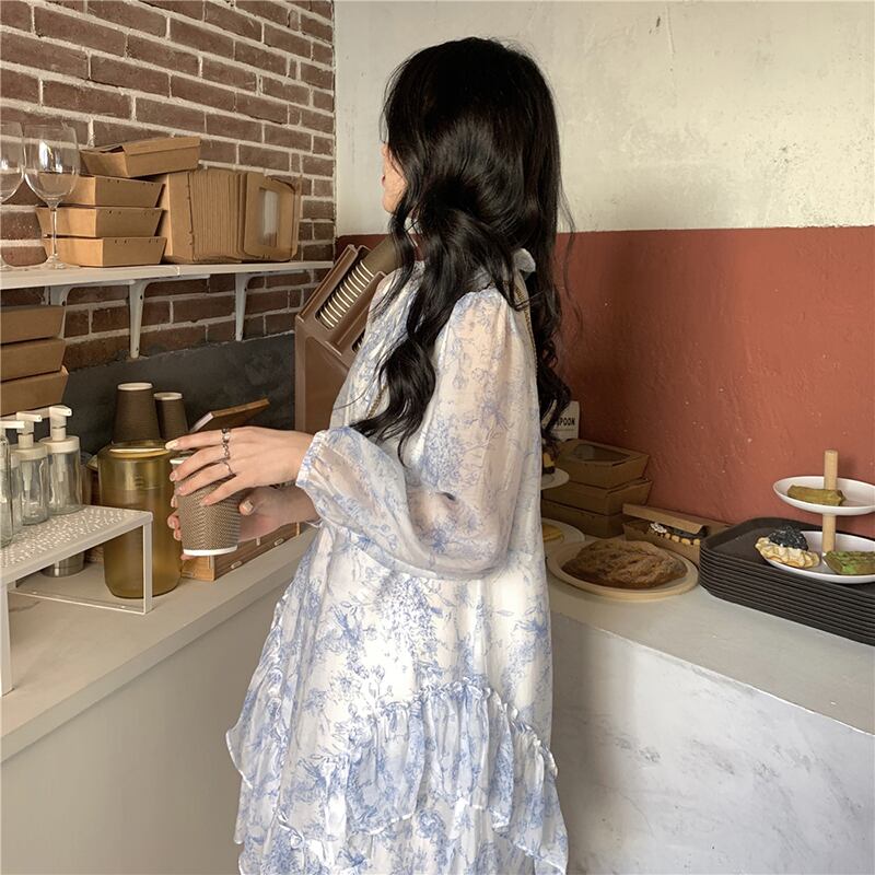 2021年春秋新作ルーズでスウィートな年齢を減らす蓮の葉レースミドル丈長袖シフォンドレス女性スカート ロング 大人ガーリー キュート カジュアル スプリング 春物 オータム 秋物 可可里29397309909