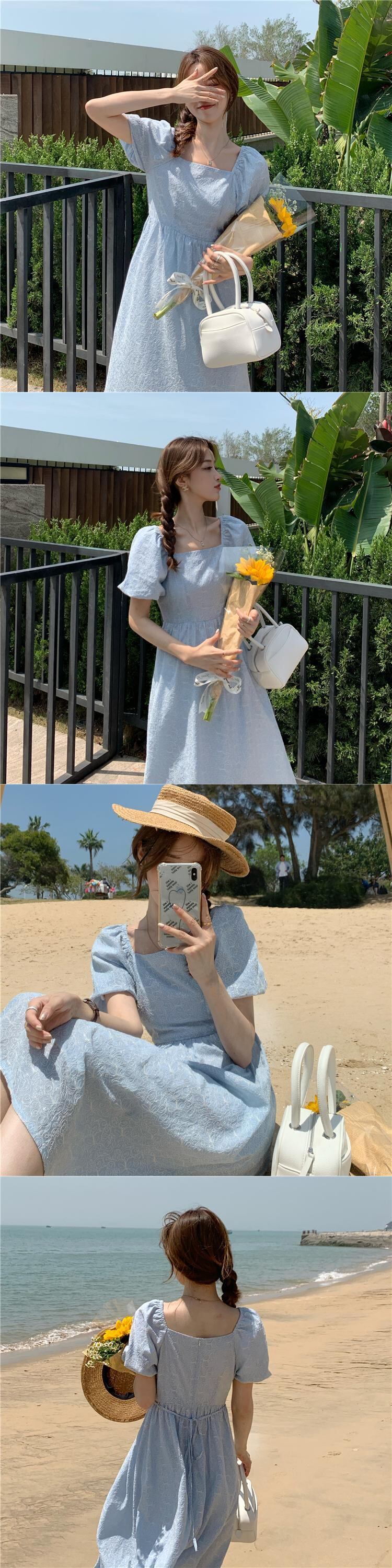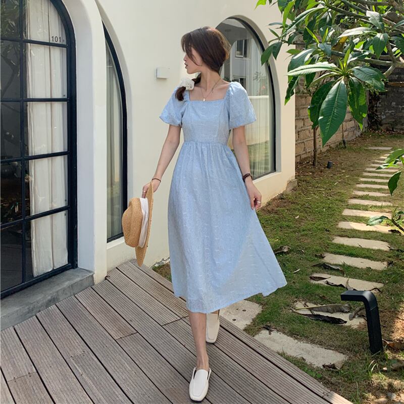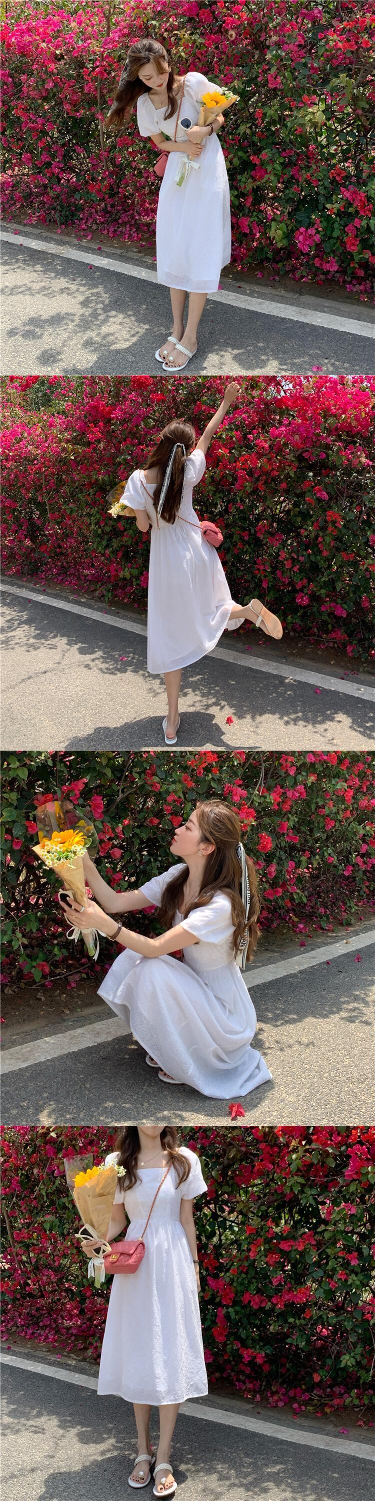 2021年夏の新しいフレンチヘップバーンスタイルのウエストは、より薄いミドル丈のスクエアカラーレース半袖ドレスの女性のスカートでした サマー 夏物 スクウェア 可可里40200650534