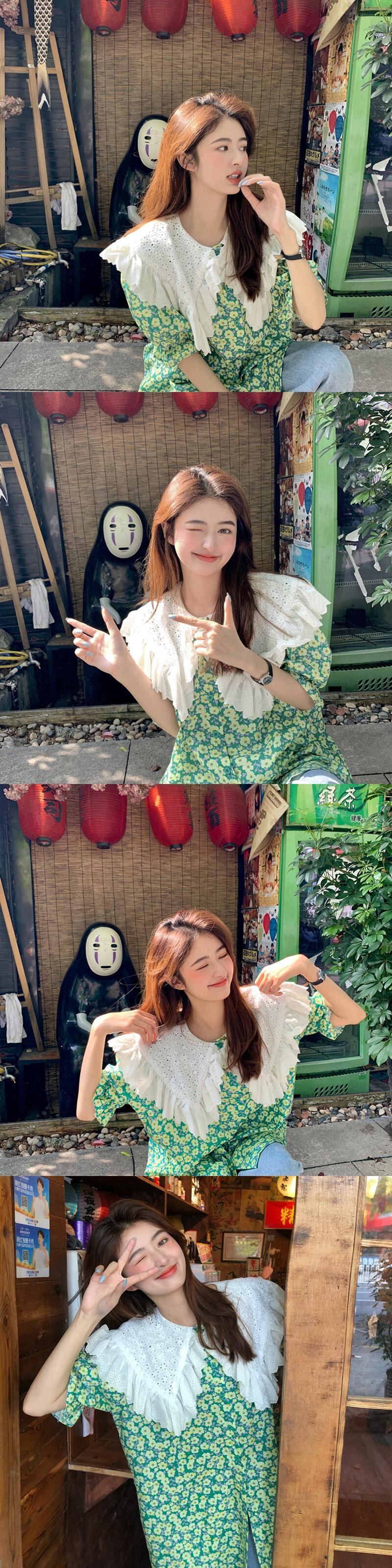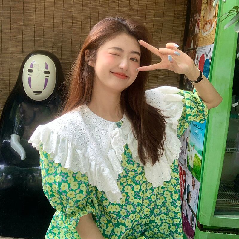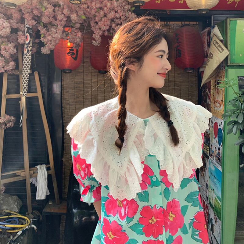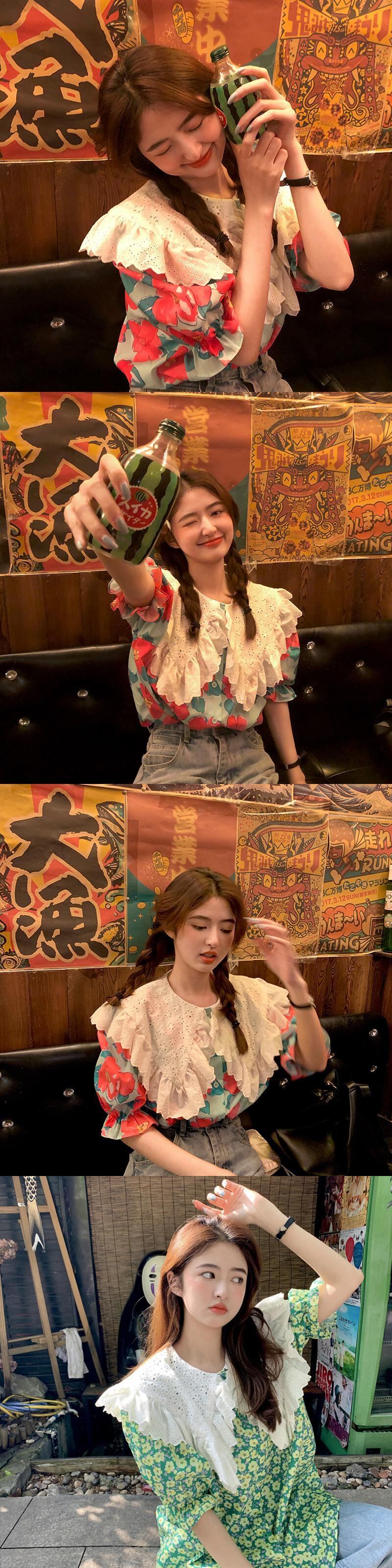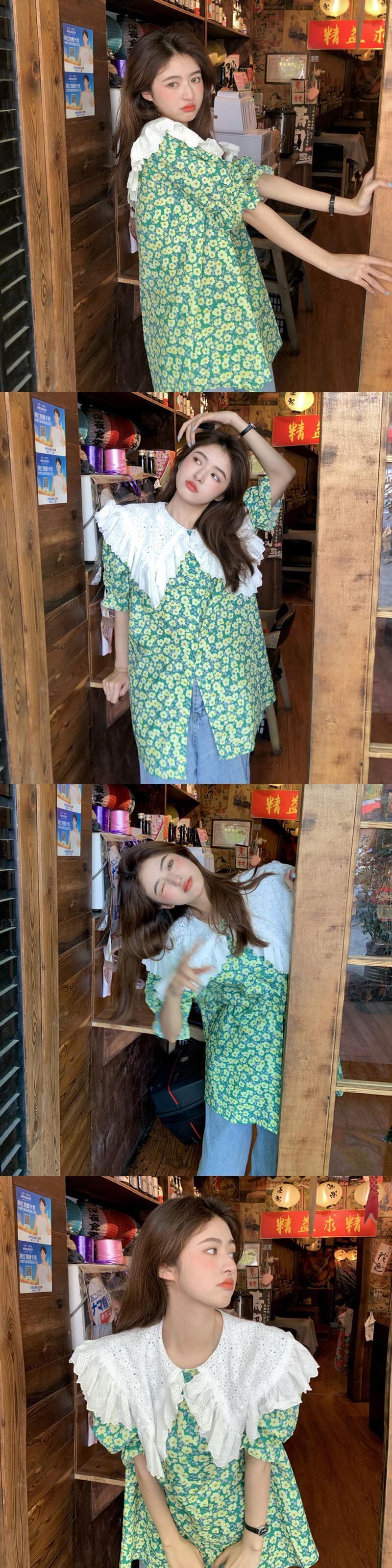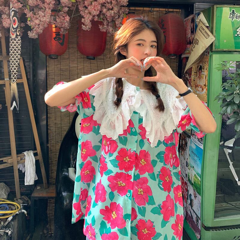 2021年夏の新しいデザインセンスウエスタンスタイルの年齢を減らす大きな襟ルーズミドル丈フローラル半袖シャツトップ女性 サマー 夏物 花柄 可可里97324114332
