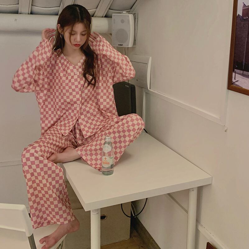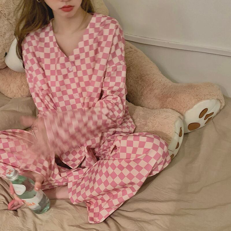 Vネックチェック柄長袖パンツホームサービススーツ2021年秋新作甘くて薄いカジュアルパジャマ女性 ロング 大人ガーリー スウィート キュート オータム 秋物 可可里74220464743