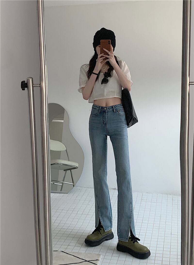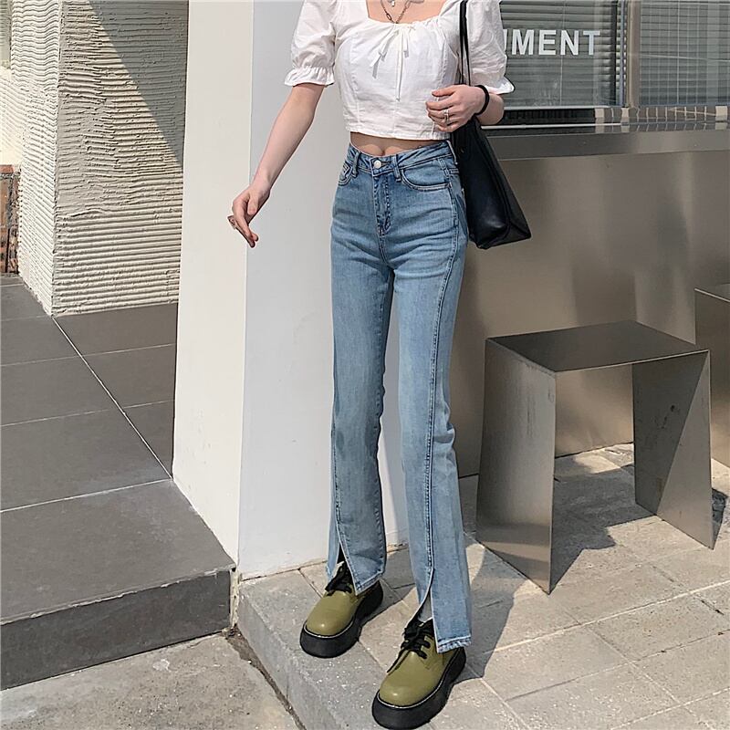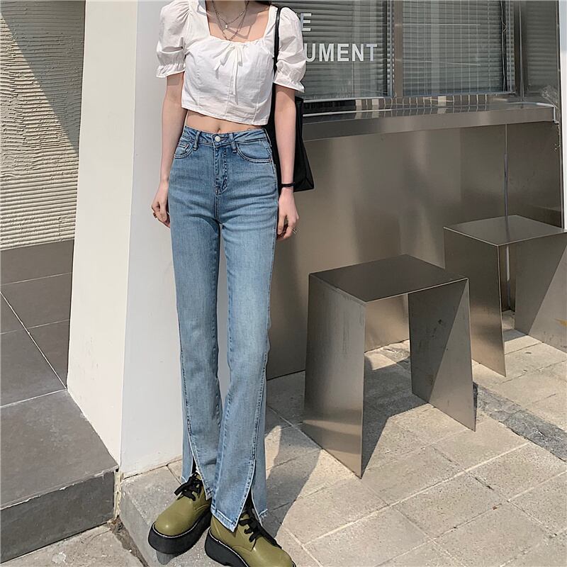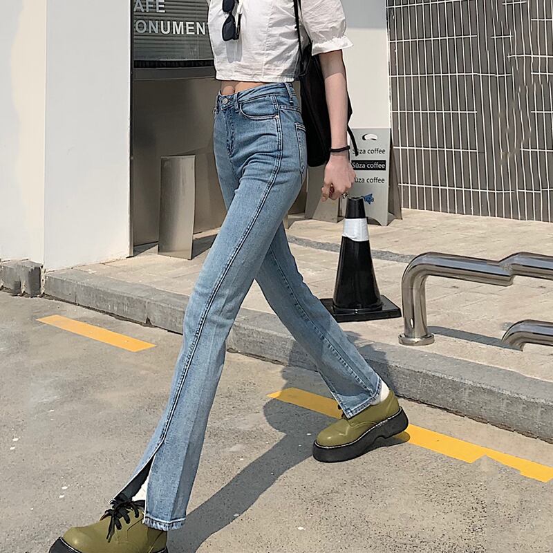 マイクロフレアジーンズ女性の2021年夏の新しいスタイルのハイウエストストレートレッグパンツタイトフィットスプリットパンツinstide レッド サマー 夏物 可可里62766413907