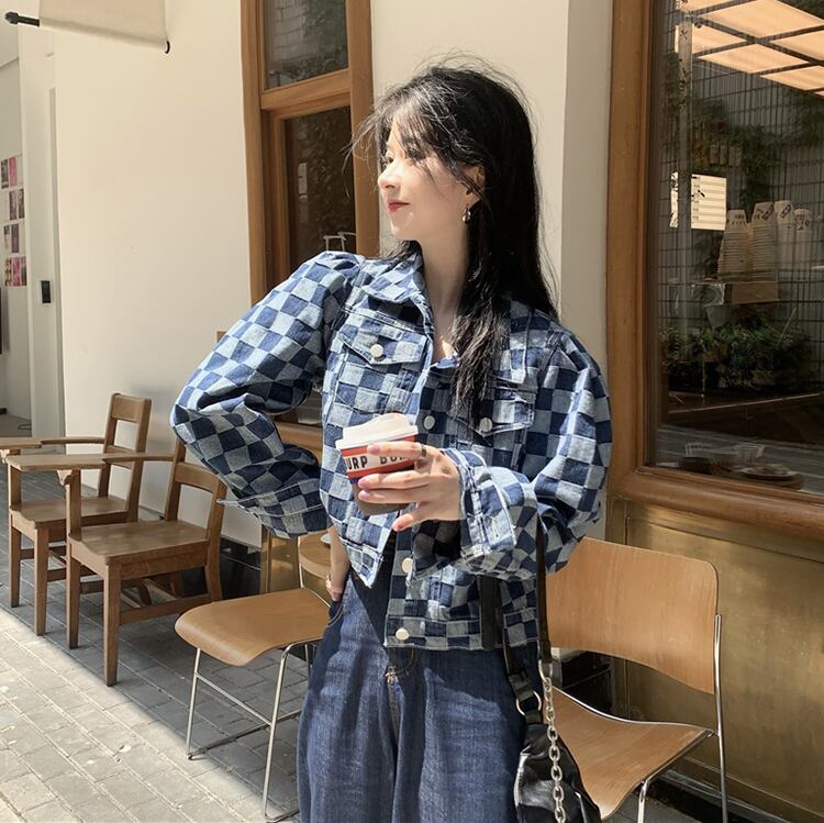 2021年秋新作ファッションシックフレンチレトロショートチェック柄ルーズカジュアル長袖デニムジャケット女性トレンド ロング オータム 秋物 可可里58509804498