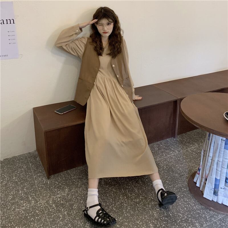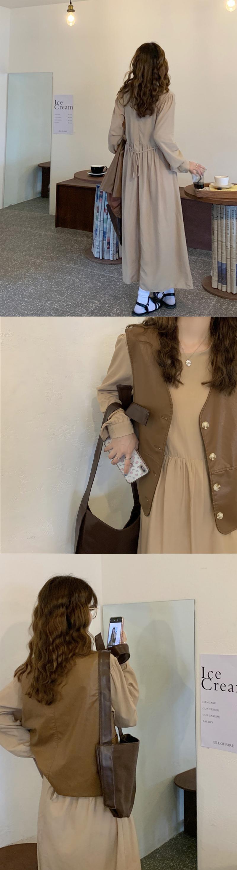 色:ライトカーキドレス,コーヒーカラーのレザーベスト