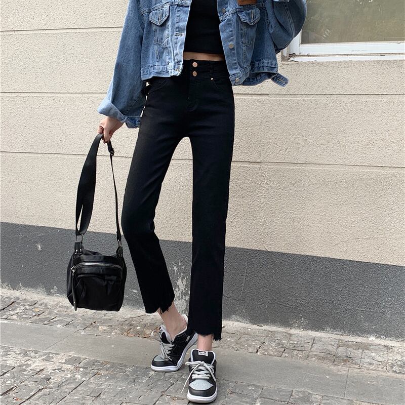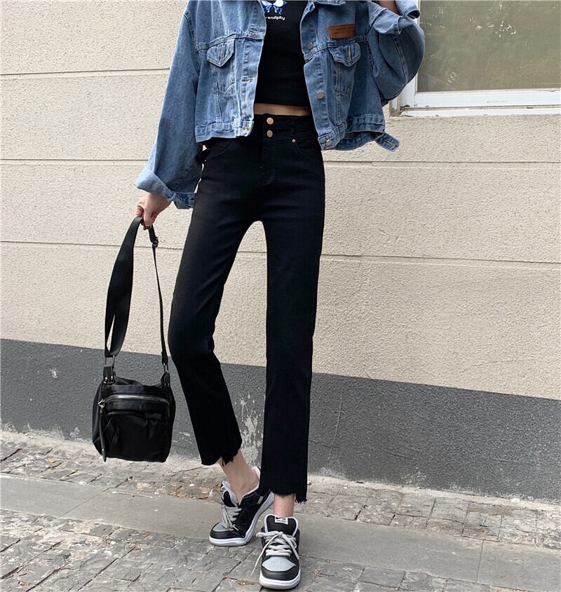 ナインポイントジーンズ女性の2021年秋新しいレトロタバコパイプパンツハイウエスト細いストレッチ生のエッジストレートレッグパンツイン ハイウェスト オータム 秋物 可可里70478586479